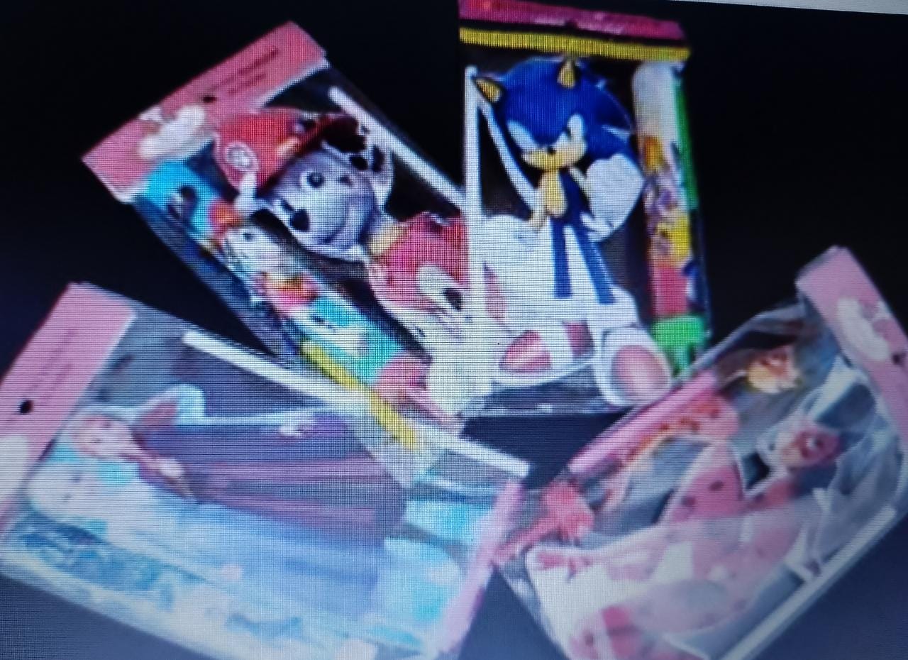 Variedad de personajes, incluye velita, vela de pirotecnia y personaje.