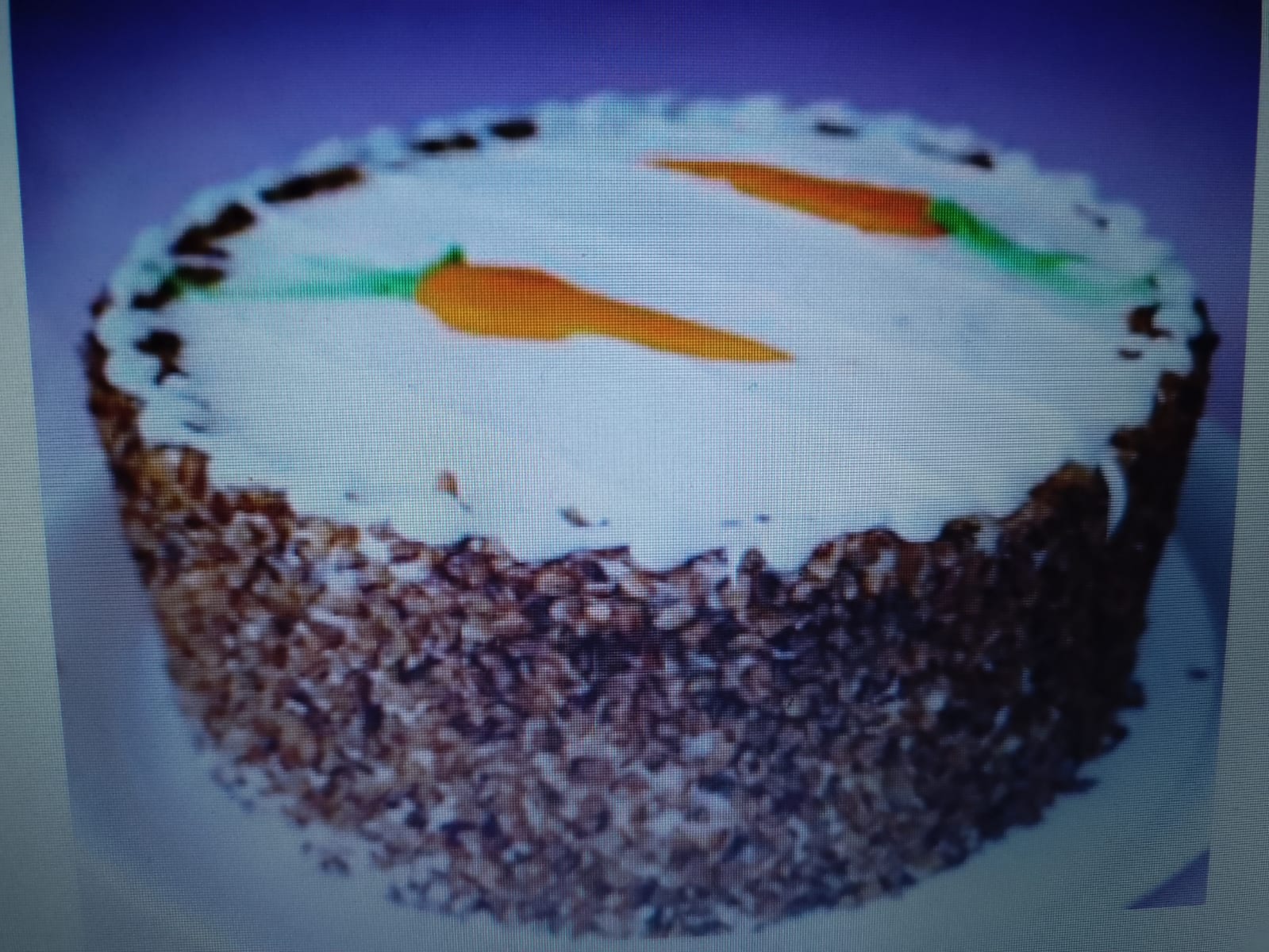 pan tipo casero con zanahoria, nuez, pasas, humectado con té de canela, relleno de cremaquilla de philadelphia, cubierto de cremaquilla de philadelphia, decorado con cuadricula de cremilla y 3 zanahorias de crema. tamaño mediano para 8 personas