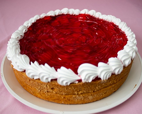 Pay de queso relleno de queso crema, fresas frescas y mermelada de fresa, decorado con crema a la orilla para 12 a 15 personas aproximadamente