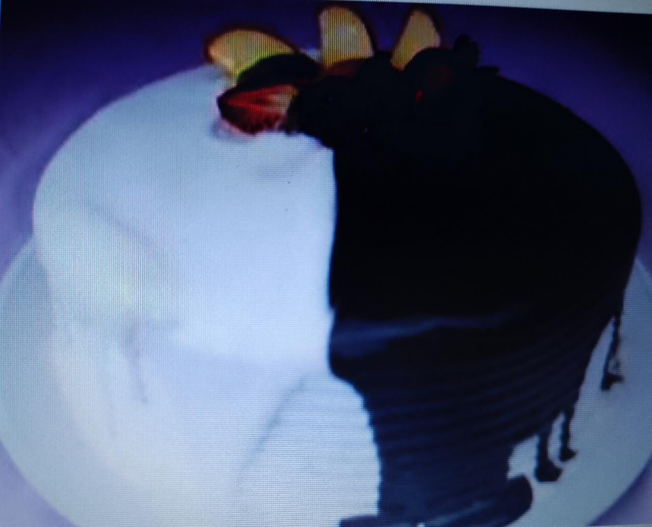 Pan de chocolate, envinado, relleno de mousse de chocolate blanco, mousse de chocolate obscuro, cubierto de crema natural de chocolate, espejo de chocolate ganash y decorado con cerezas. Para 8 Personas aproximadamente