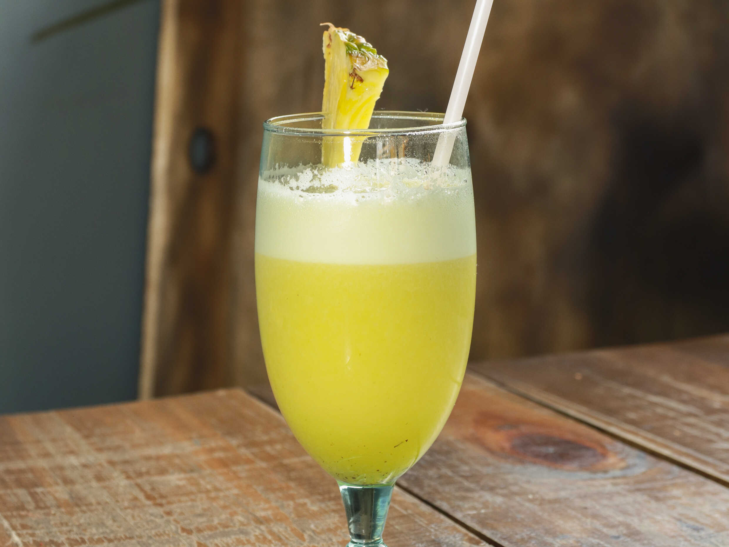 Pan de baguette integral, aderezo de la casa, 100 grs. de pechuga de pollo en salsa BBQ, cebolla, lechuga, piña asada, queso gouda gratinado, acompañado de papas fritas.