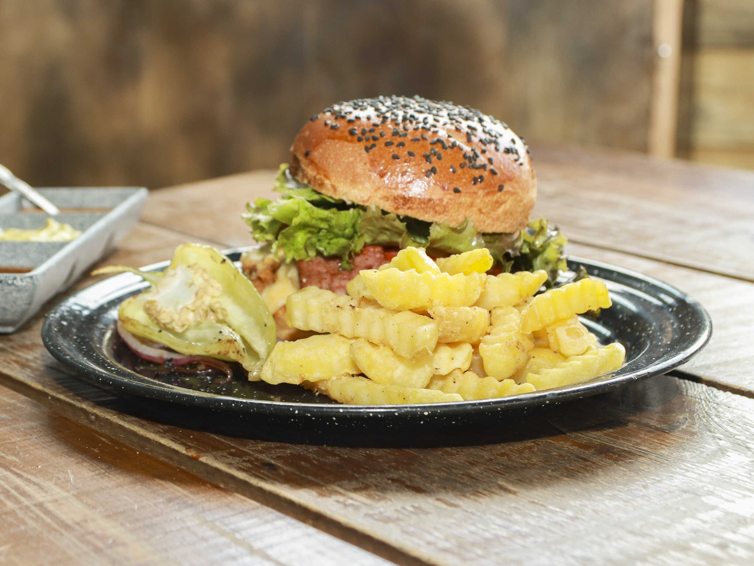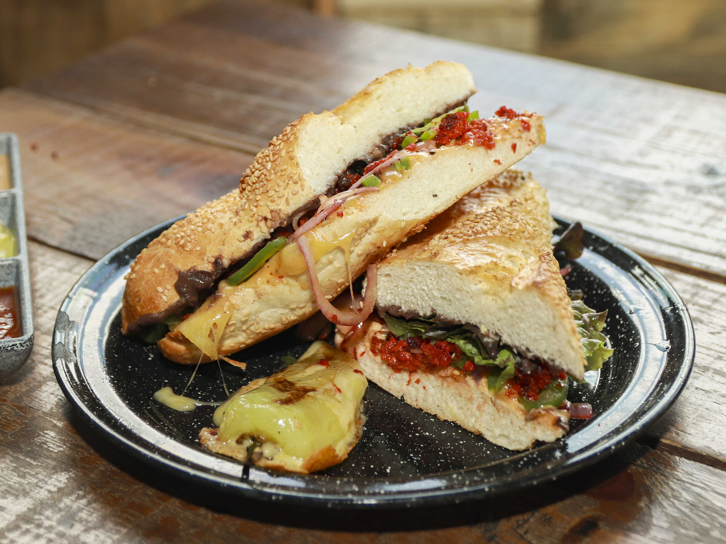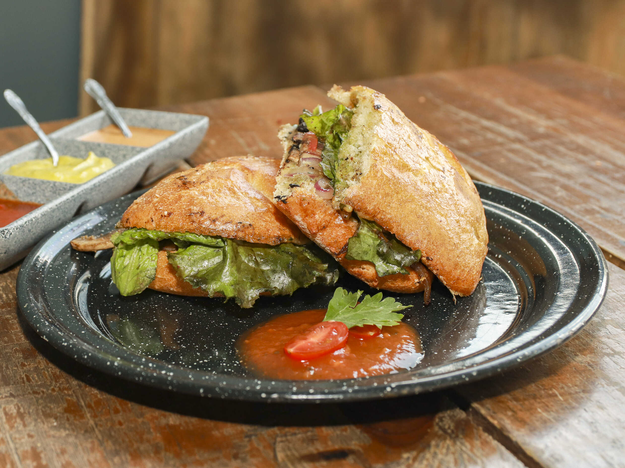 Pan de chapatta crocante, aderezo de la casa, espinaca, tomate, cebolla morada, selección de queso, pimientos salteados, portoblello al vino blanco, acompañado de papas fritas.