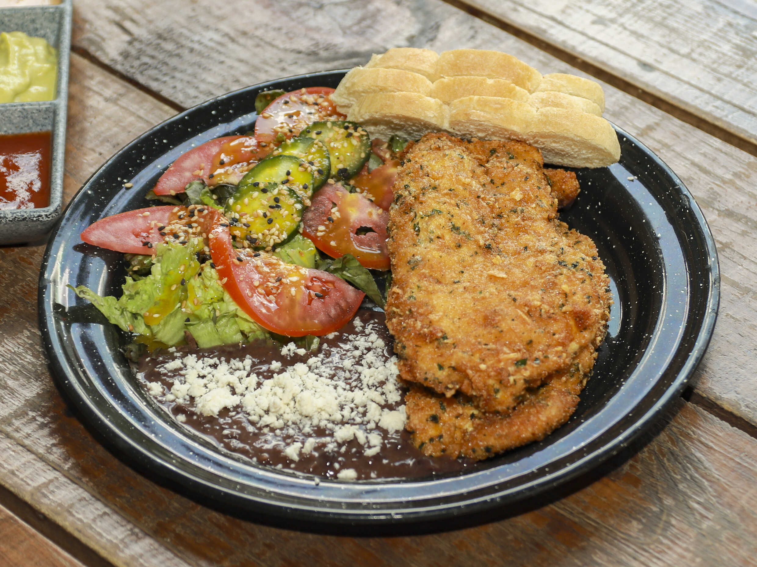 Pan de chapatta, aderezo la casa, espinaca, tomate, cebolla morada, 150 grs. de pechuga de pollo empanizado en queso parmesano, salda pomodoro. Selección de quesos, acompañado de papas fritas.