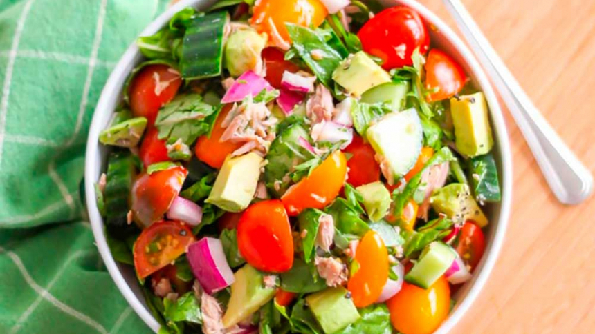Lechuga, espinaca, pimientos, queso panela y fruta de temporada.