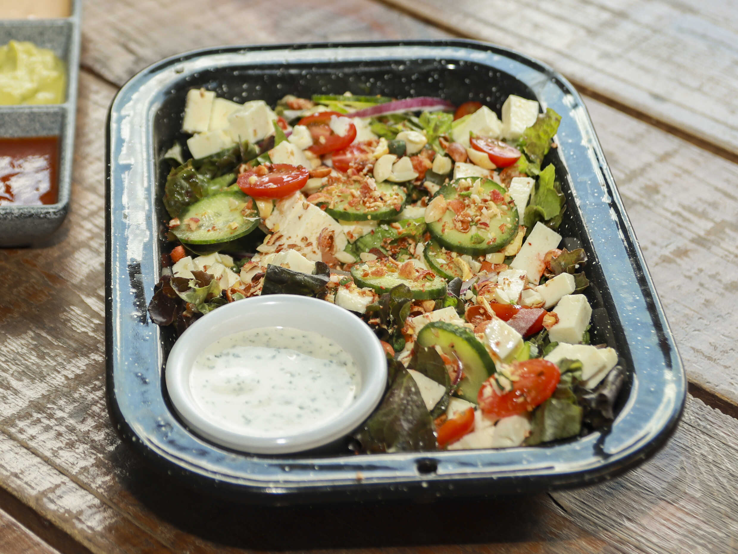 Lechuga, espinaca, queso panela, tomate, pimientos, pepino, cebolla morada, champiñón.