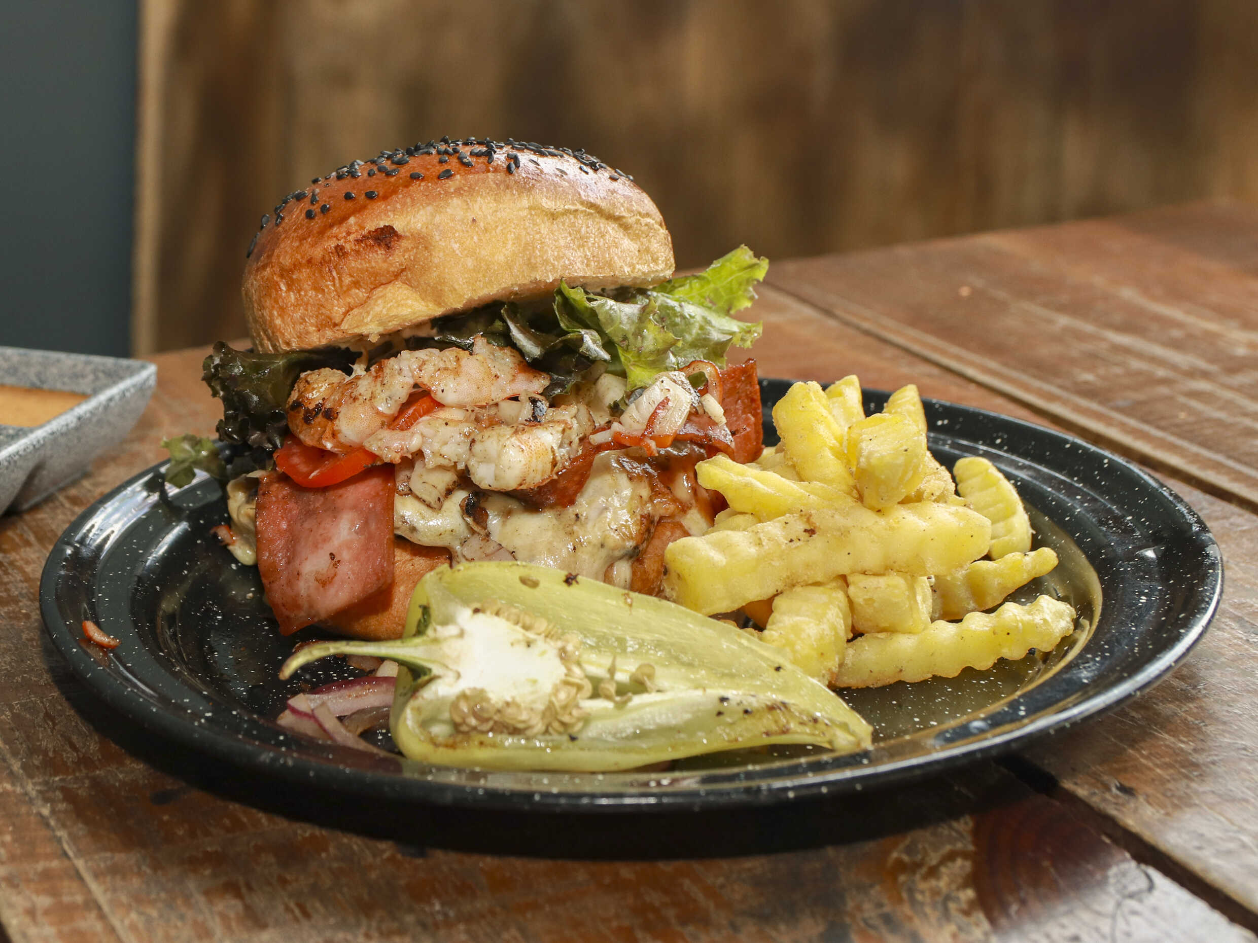 combinación de lujo que lleva una jugosa carne de ternera premium, con camarones a la plancha. La mezcla de sabores resalta increíblemente con nuestra selección de quesos fundidos y el toque del aderezo de la casa