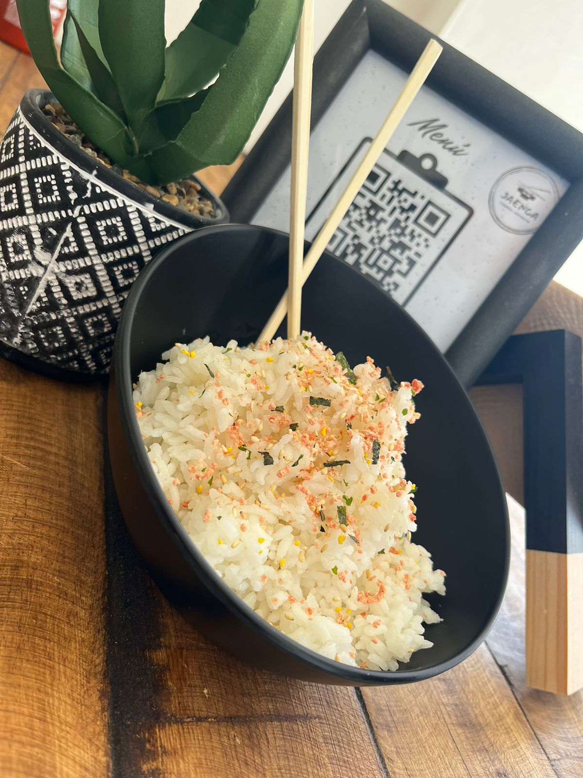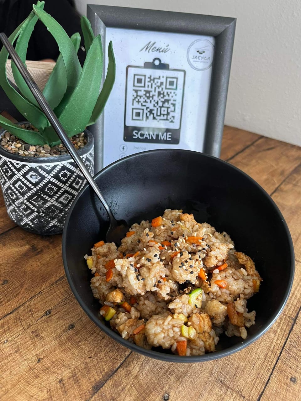 Frito de arroz a la mantequilla con verduras y 2 carnes.