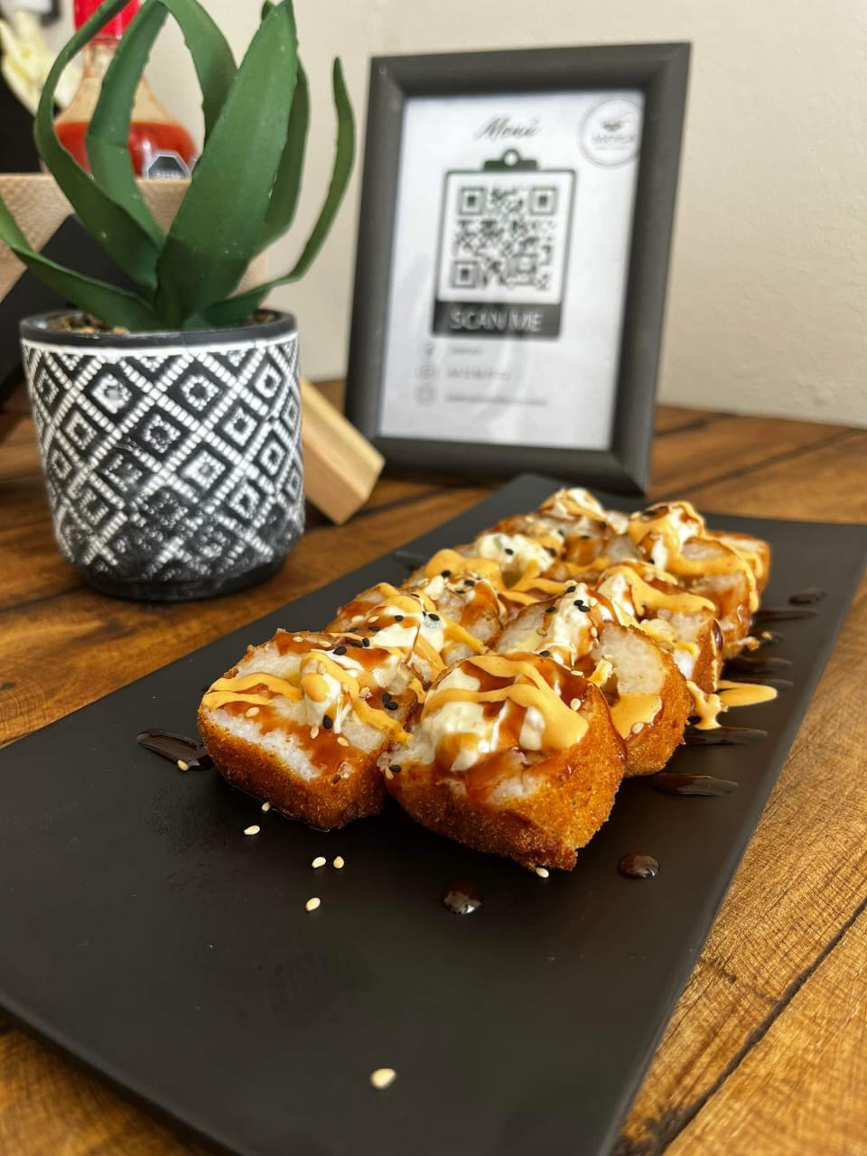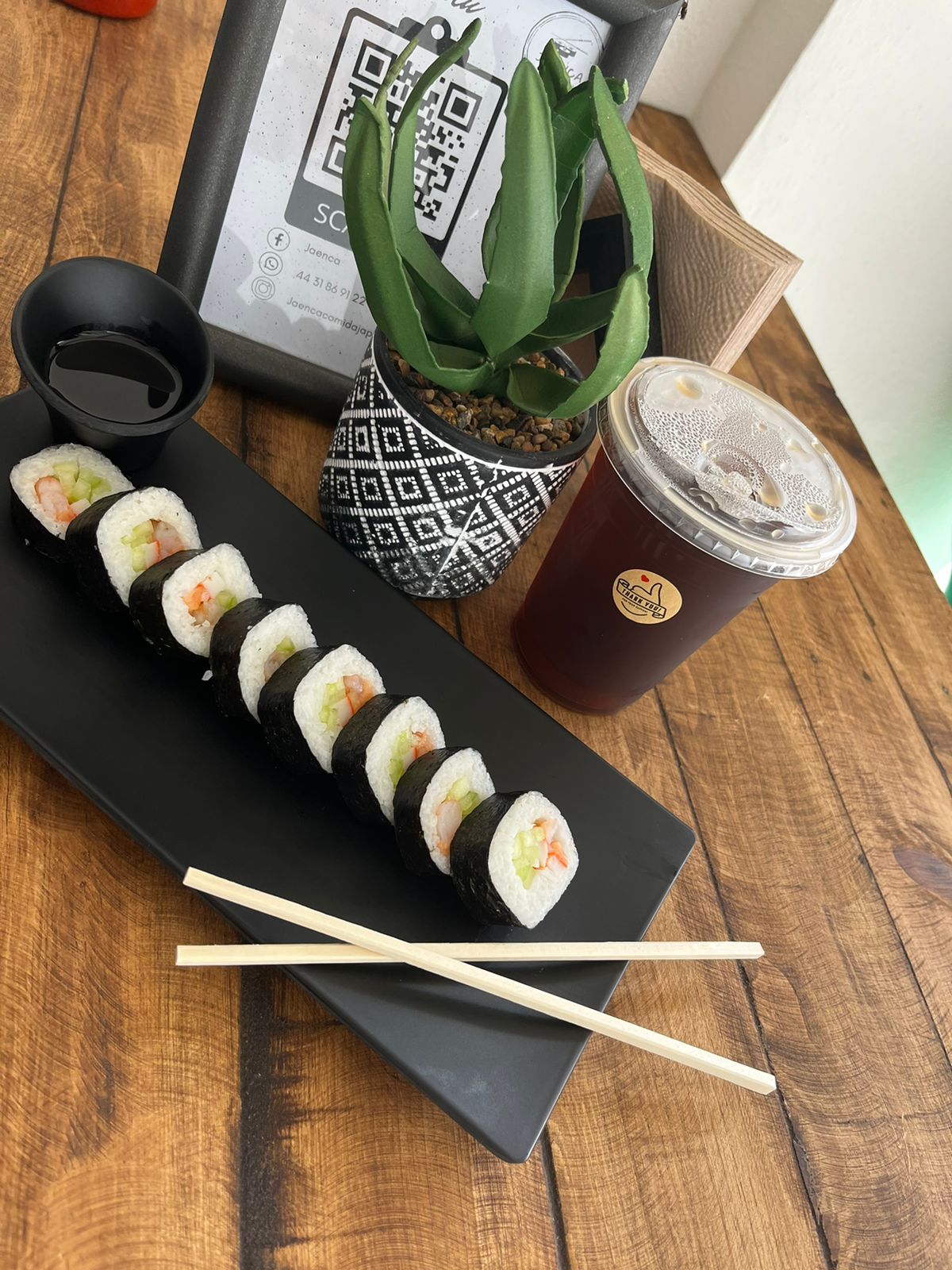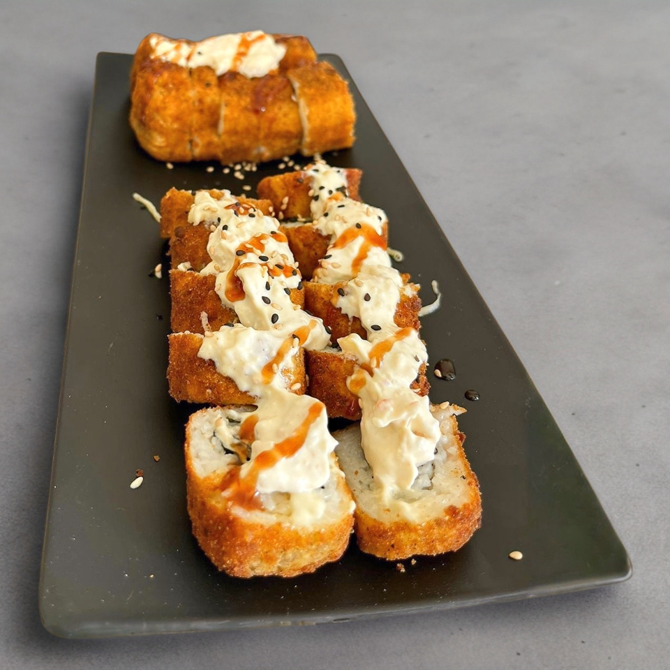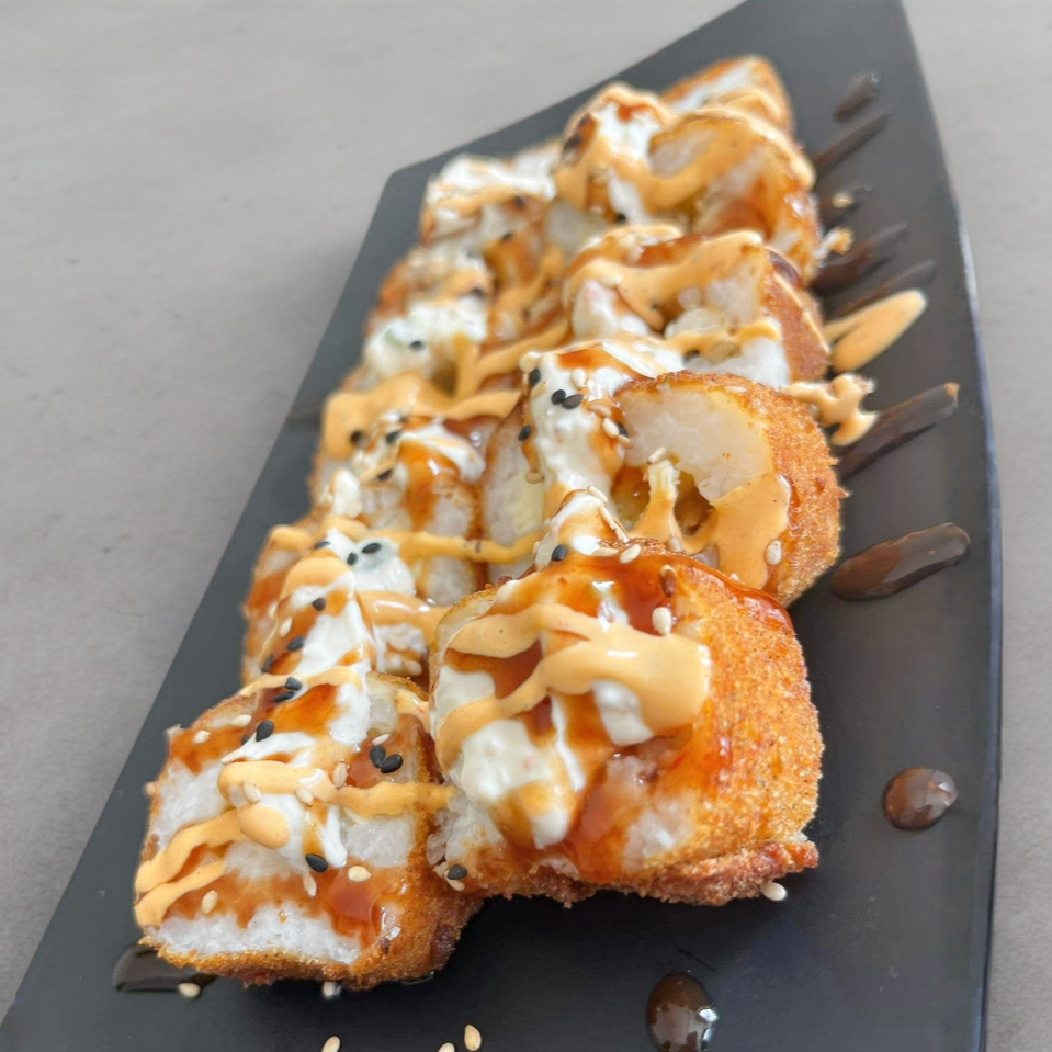 2 rollos, 6 camarones, queso philadelphia y queso manchego, aderezo salsa soya dulce.