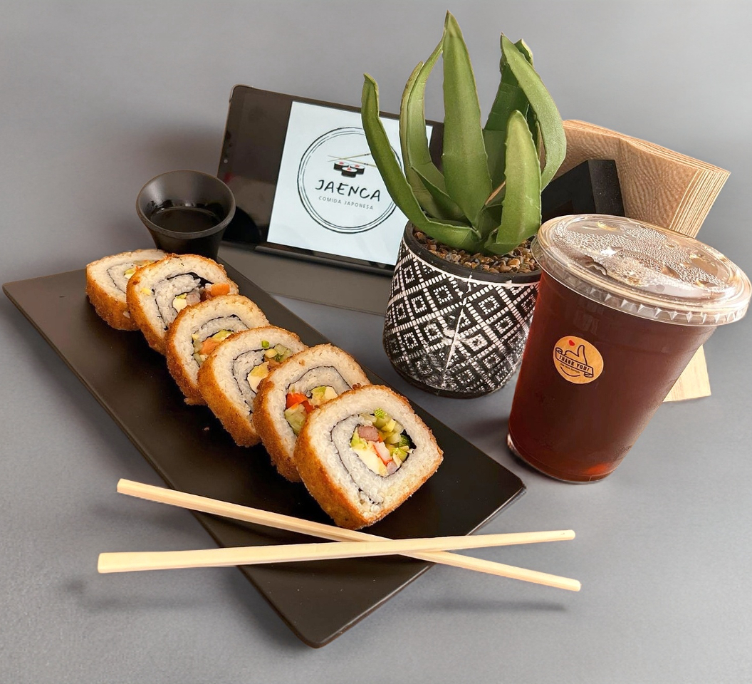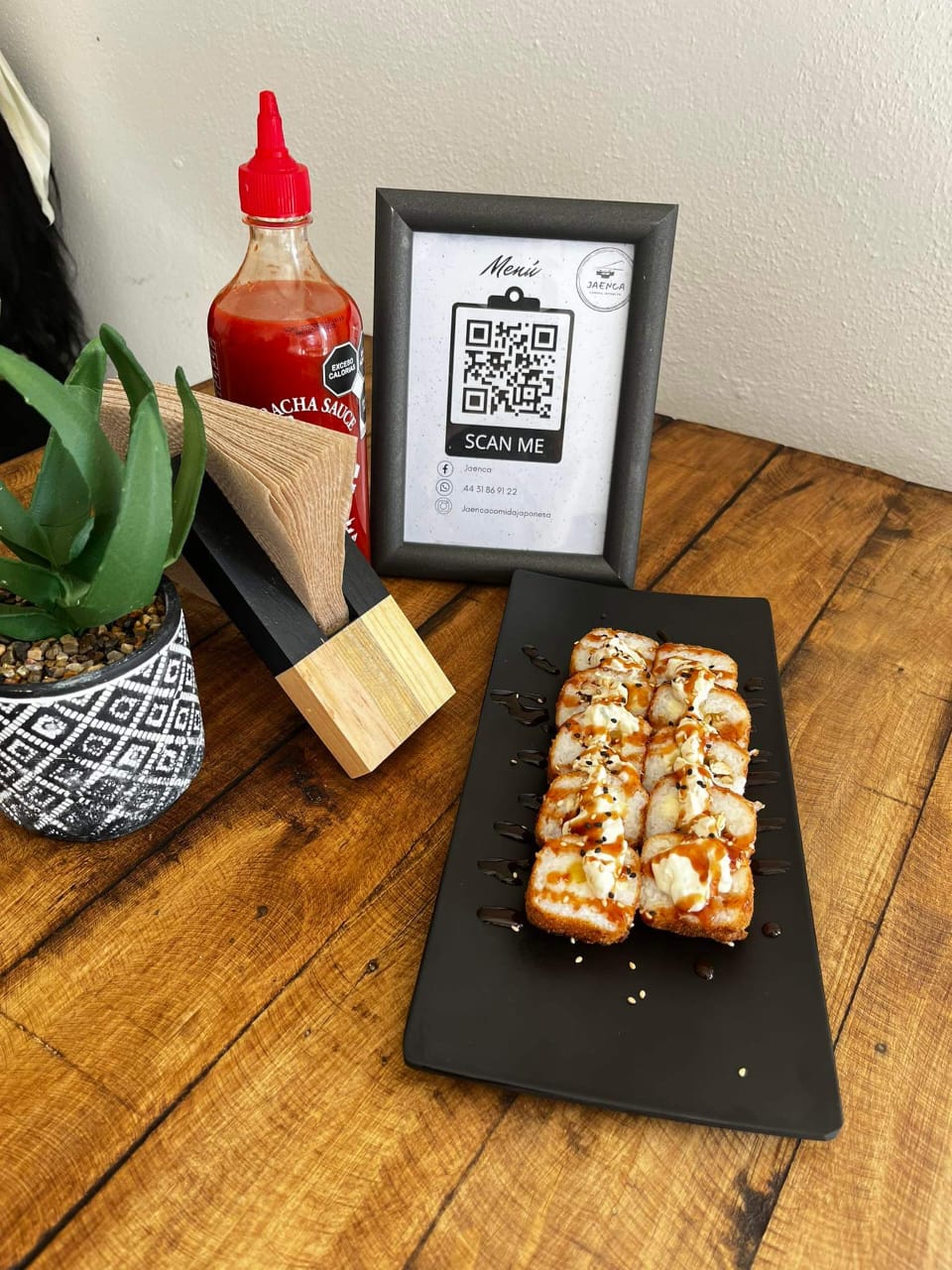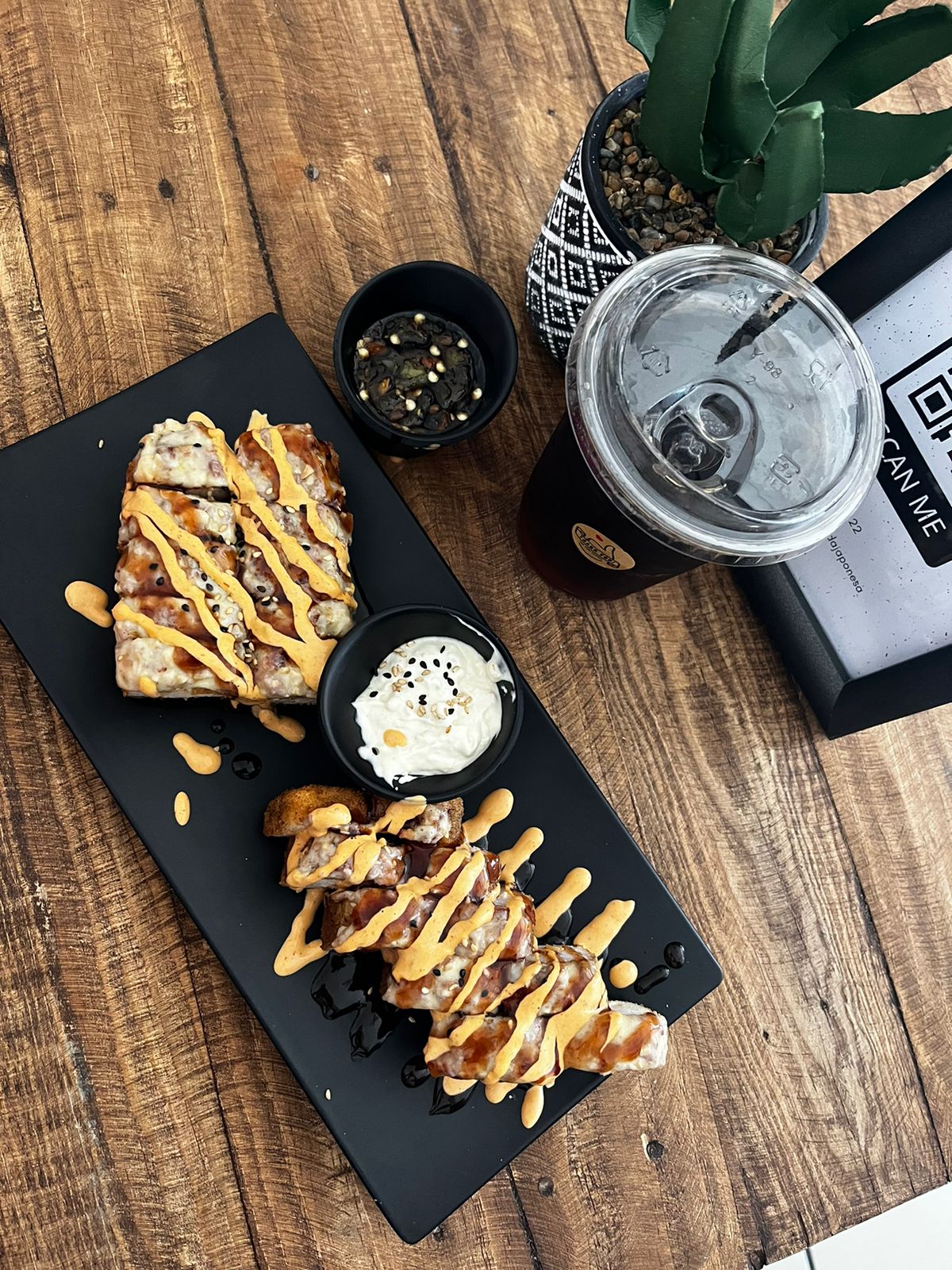 2 rollos, 6 camarones, queso philadelphia y queso manchego, aderezo salsa soya dulce.