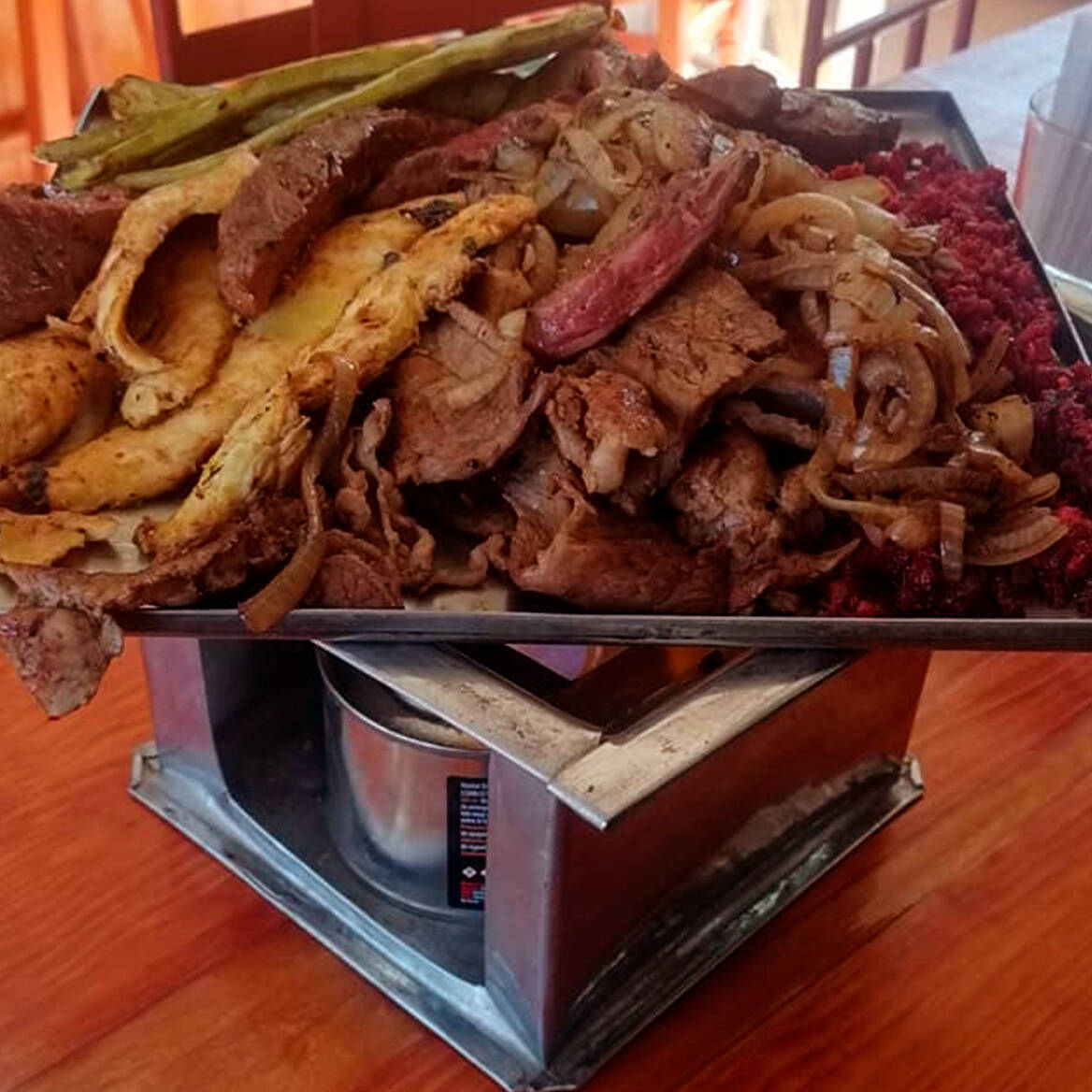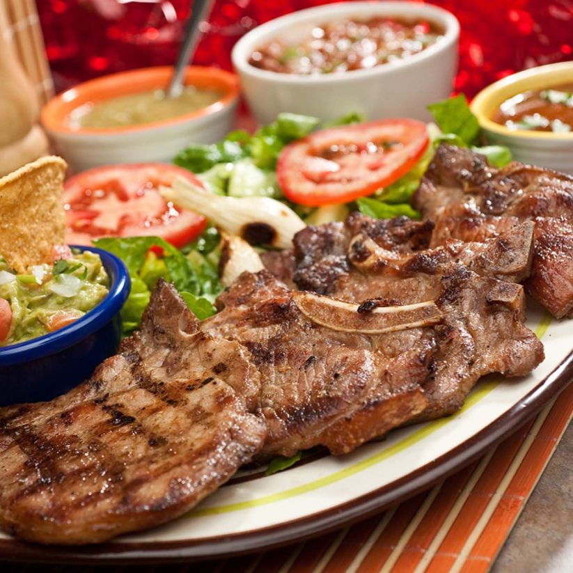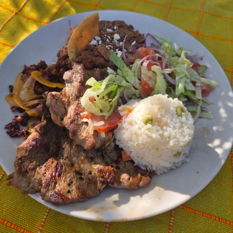 Deliciosa y suave carne de res, acompañada de chorizo, frijoles, arroz, ensalada y nopalitos asados.