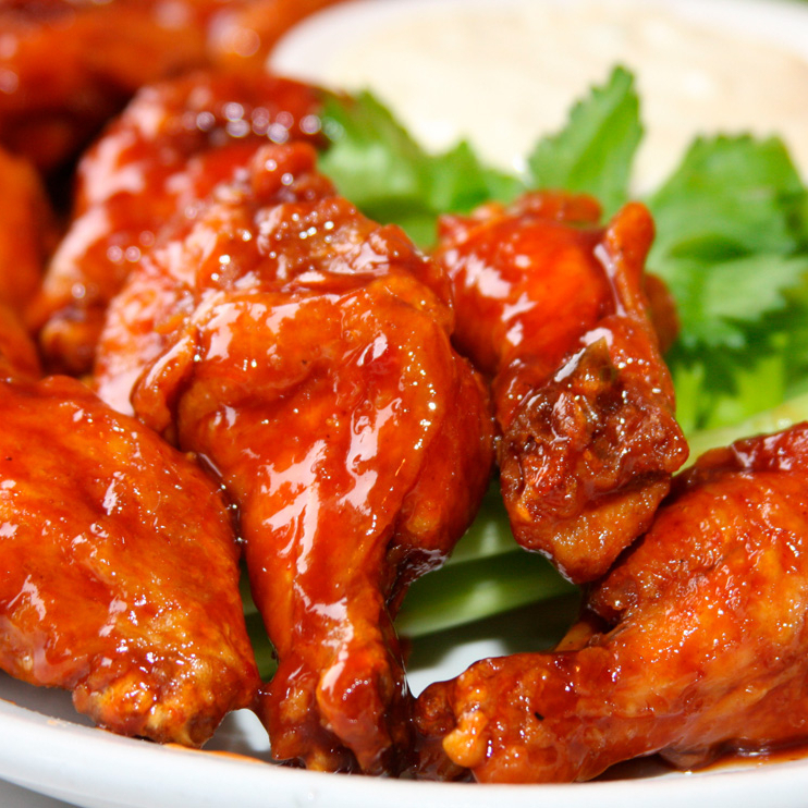 8 Alitas (peso antes de cocción) bañadas con salsa de su elección acompañados de aderezo ranch, zanahoria y apio.