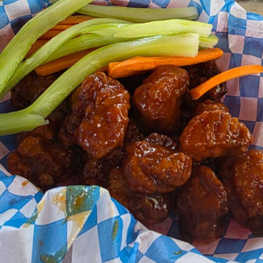 Trozos de pechuga de pollo empanizadas bañadas con la salsa de su elección (peso antes de cocción) acompañados de aderezo ranch, zanahoria y apio.