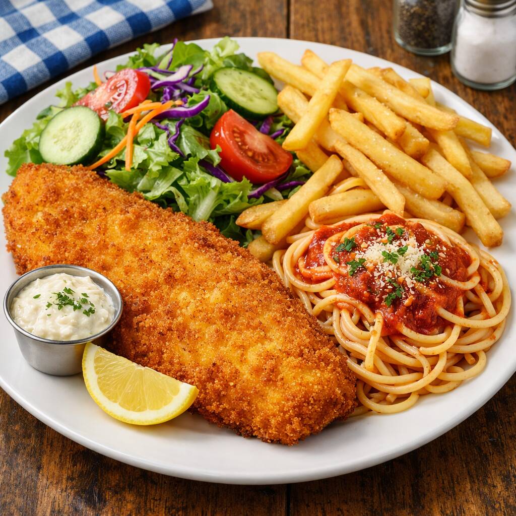 Carne de res o pollo empanizada, acompañada de frijoles, arroz o espagueti, ensalada y papas a la francesa