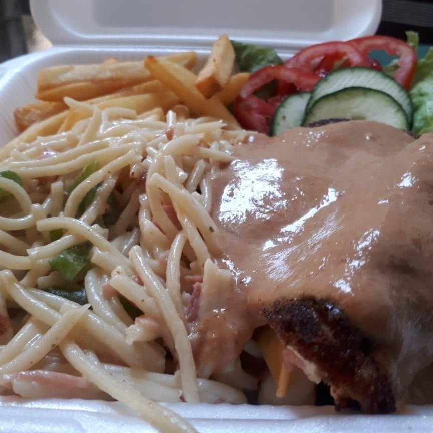 Pechuga rellena de jamon con quesos, bañada con crema de champiñones al chipotle, acompañada de papas a la francesa, ensalada y arroz o espagueti