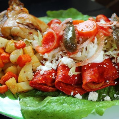 Ricas y deliciosas enchiladas placeras acompañadas de cecina, carne asada o pechuga a la plancha.