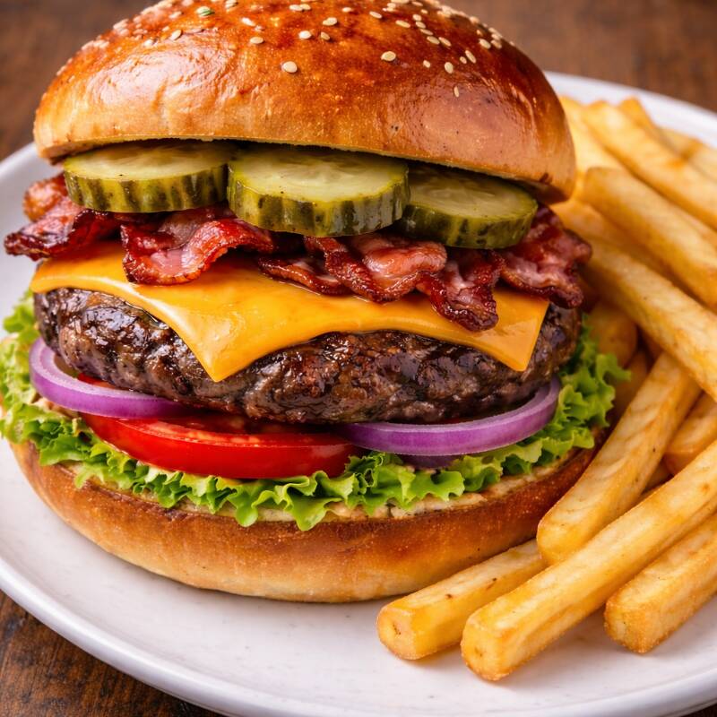 Sirloin (160 gr) tocino, salsa bbq, queso americano y guarniciones (jitomate, cebolla, pepino y lechuga)