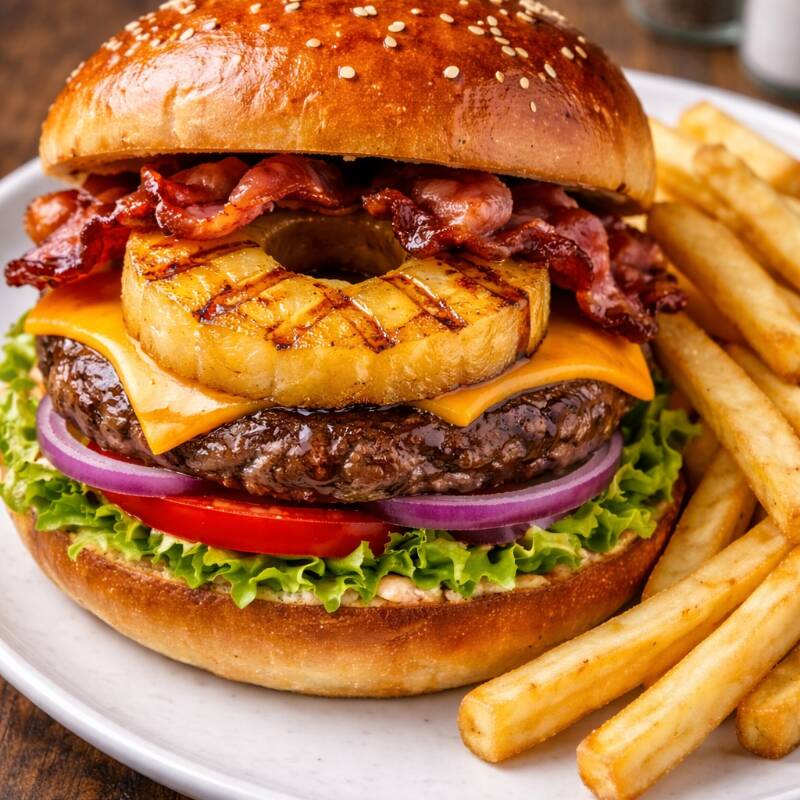 Sirloin (160 gr) piña, tocino, salchicha, queso americano y guarniciones (jitomate, cebolla, pepino y lechuga)