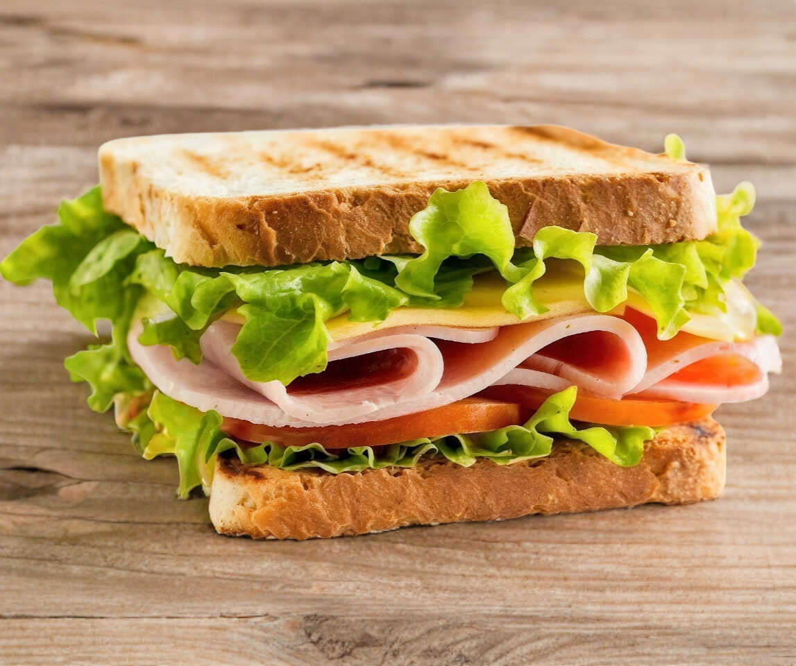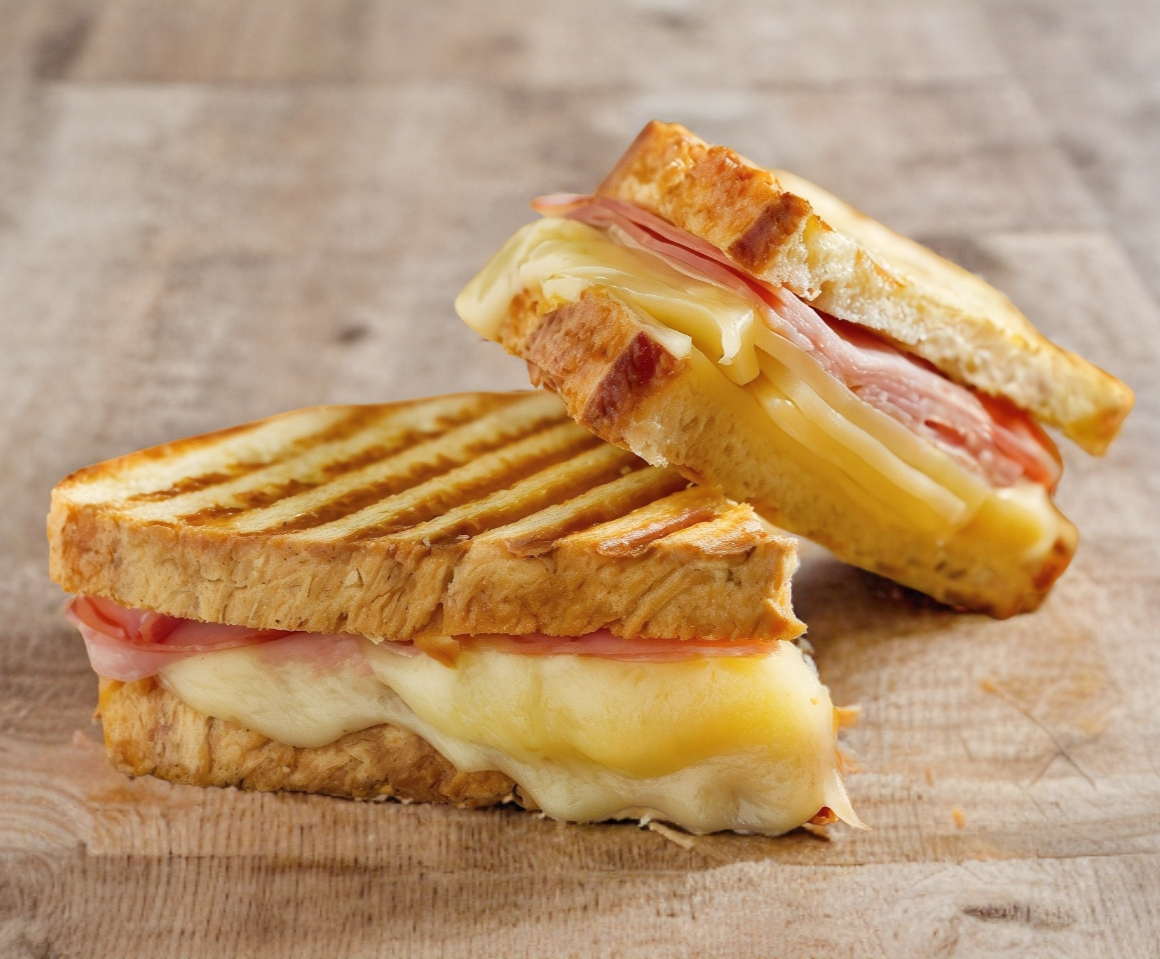 Pan, jamón y queso a la plancha con verduras y líquidos
