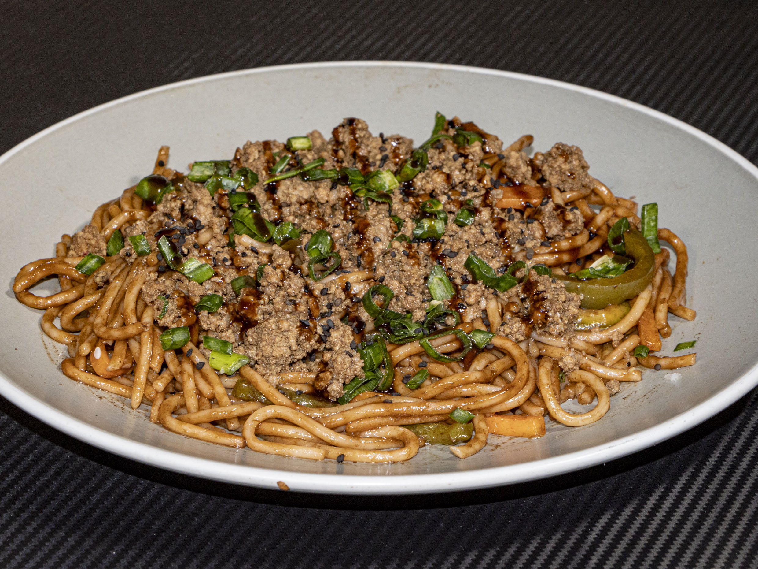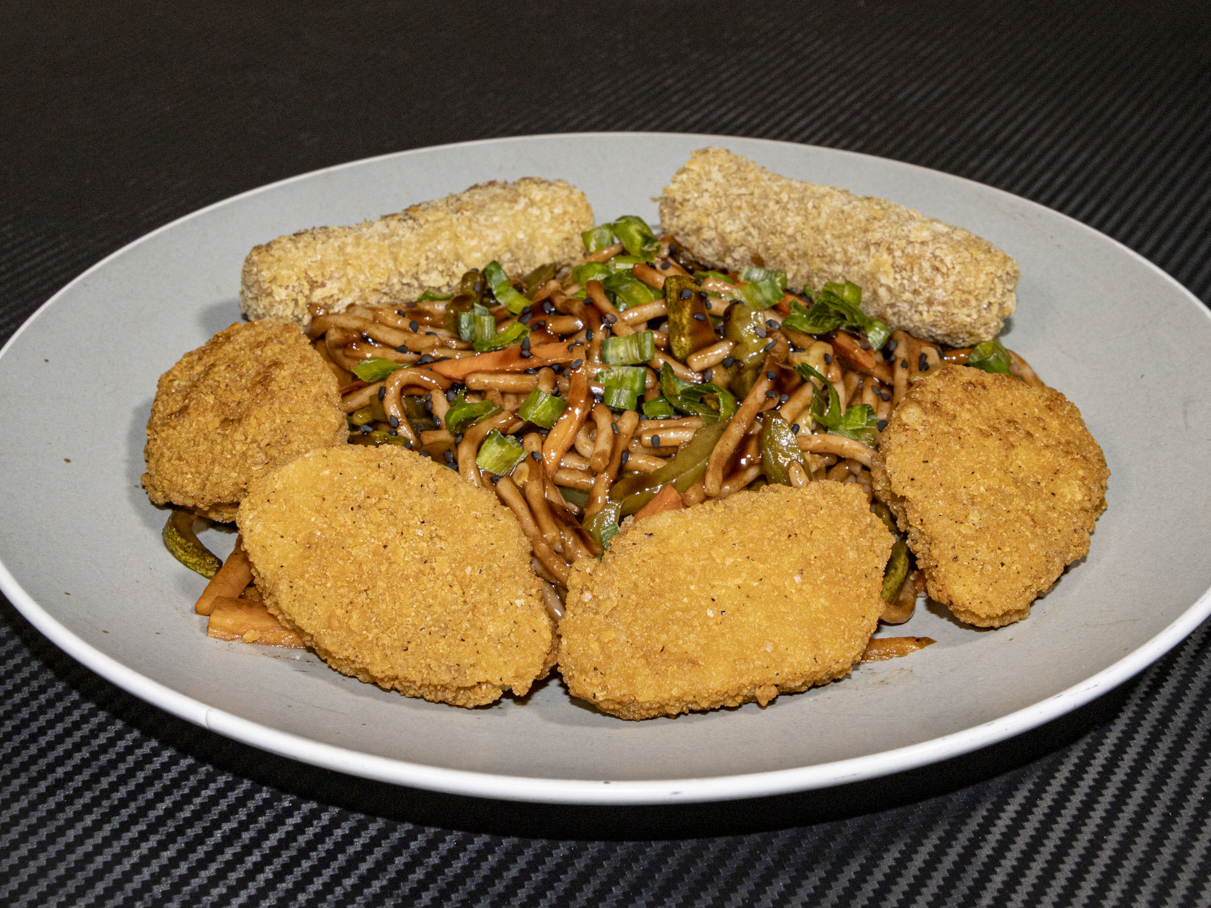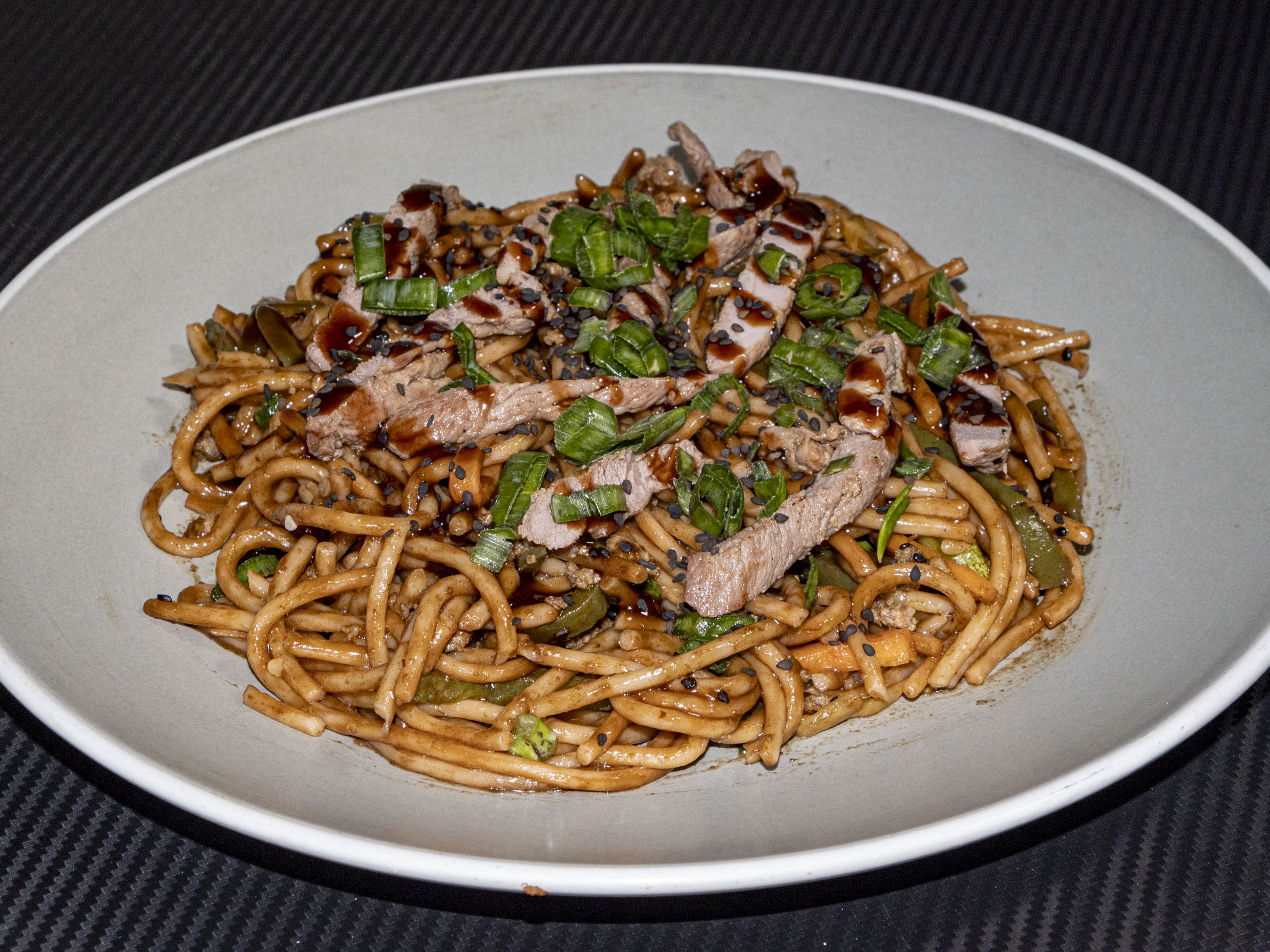 Platillo personal ;Pasta oscura ,champiñon ,cebollin ,zanahoria