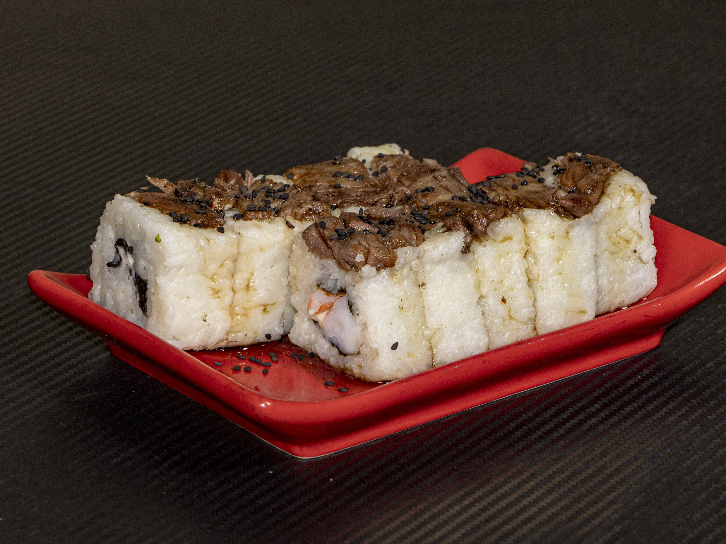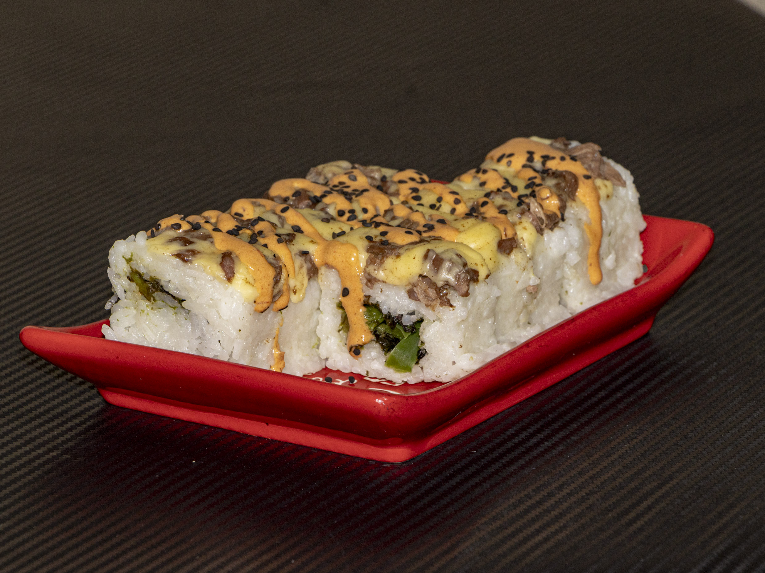 3 carnes, queso manchego, philadelphia, kani, aguacate, tampico, cebollín, camarón y empanizado