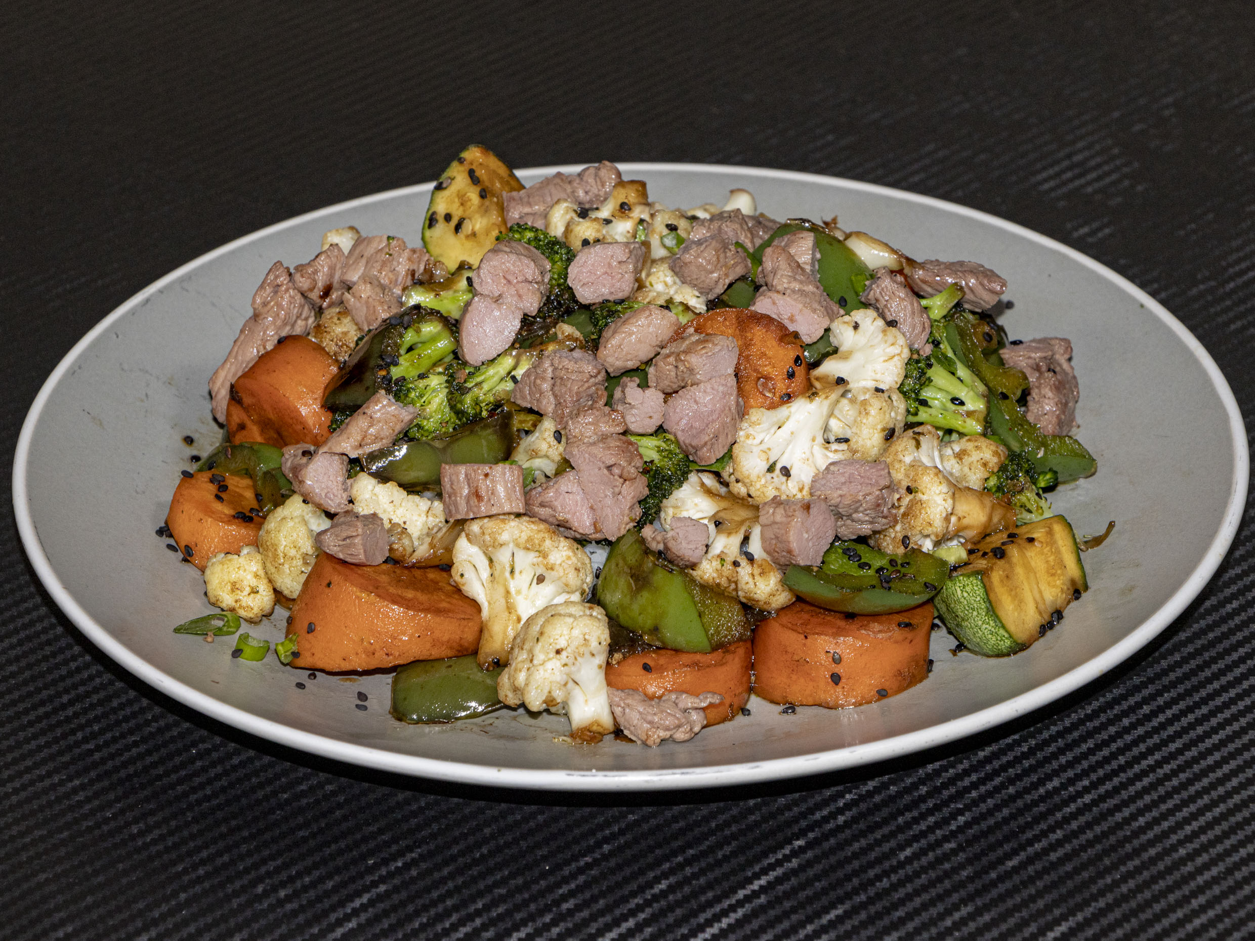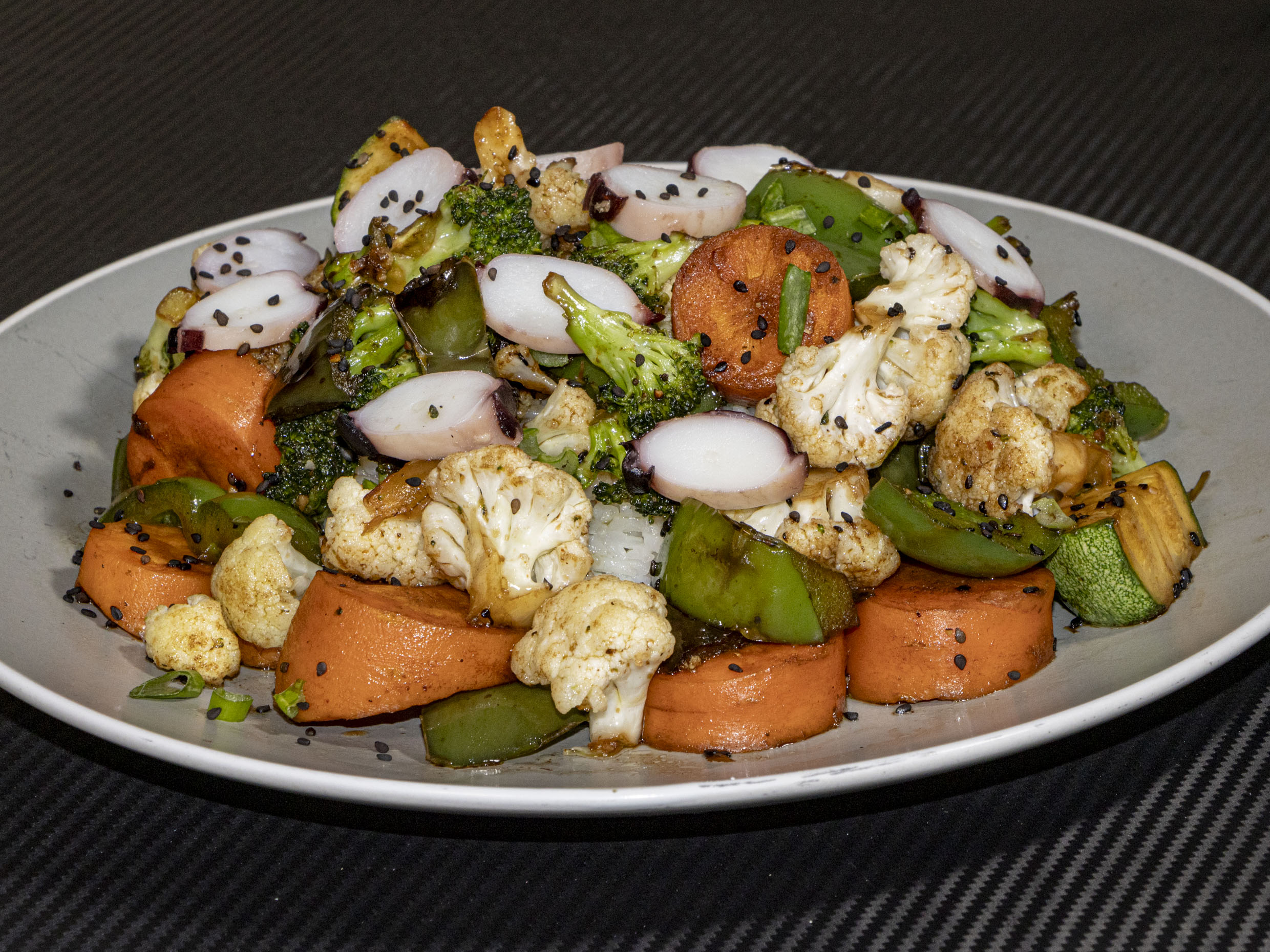 Verduras, champiñón, tofú y cebollín.