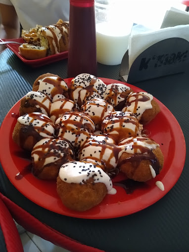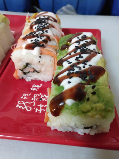 (D.) camarón, pollo, res, surimi, y pulpo q.f. q.m. tocino aguacate (F.) empanizado, salsa chipotle y ajo.