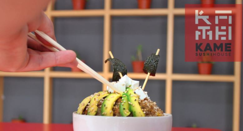 Pepino, verdura, aguacate y ajonjolí por fuera.