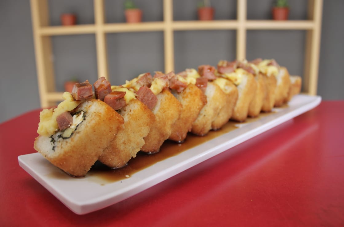 Camarón, arrachera, pepino, aguacate, empanizado y por fuera cobertura de mango con chile habanero.