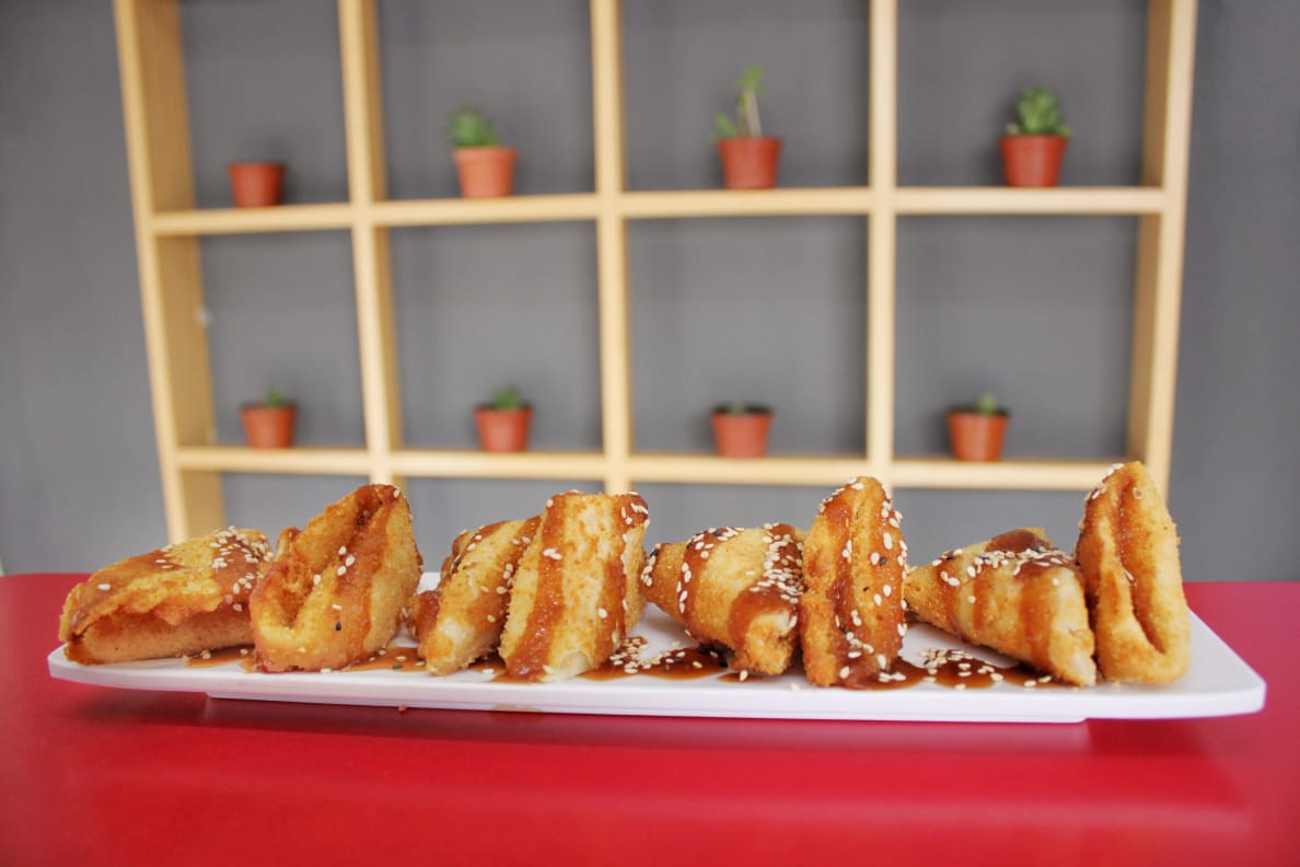 Hojaldre de harina empanizado con relleno de queso manchego y Philadelphia. Incluye aderezo kushiague y spicy mango. Orden de 8 pzs.