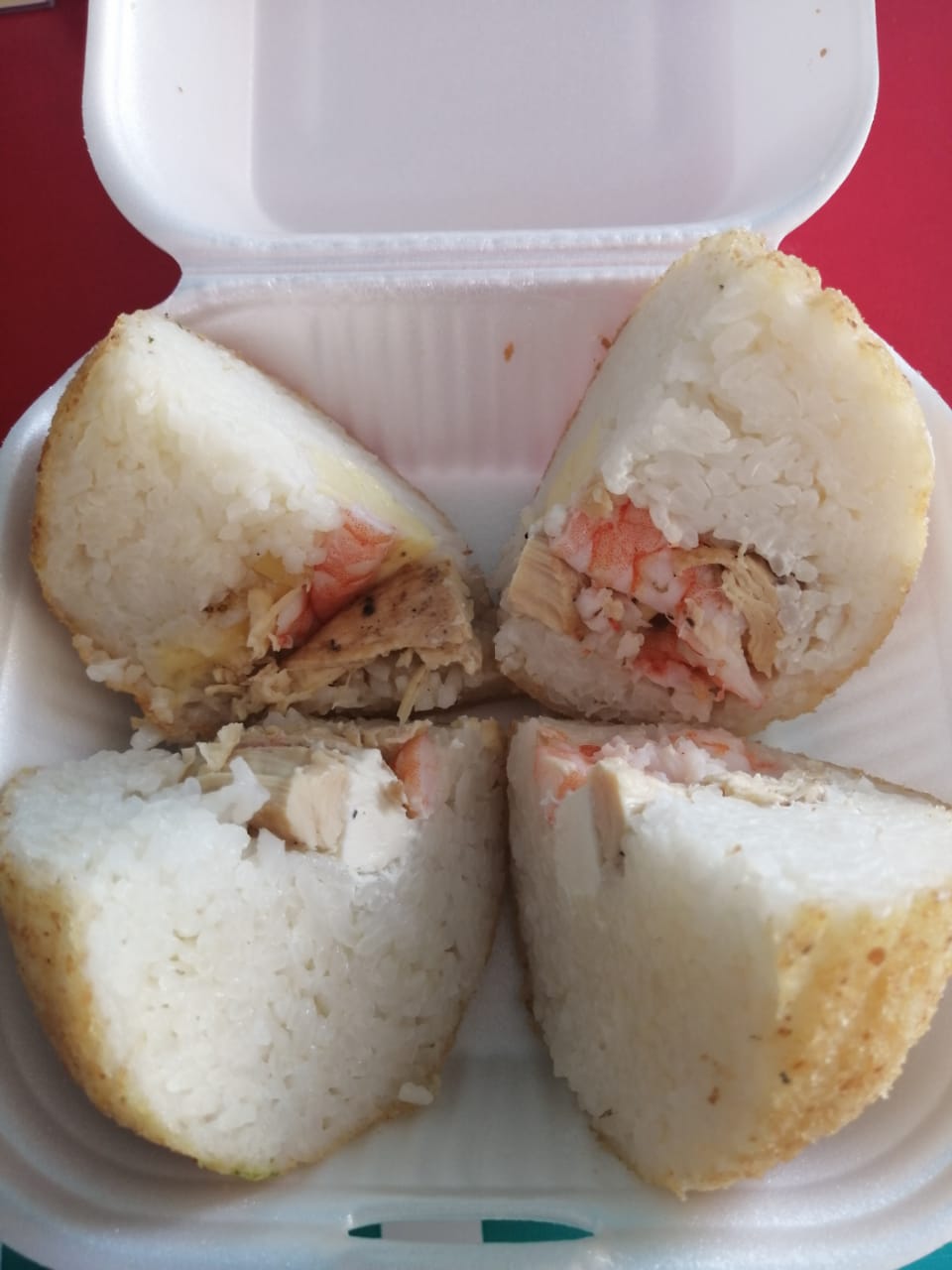 Bola de arroz empanizada rellena de queso manchego, Philadelphia, camarón y pollo. Por fuera aderezo spicy mango y espolvoreado de habanero.
