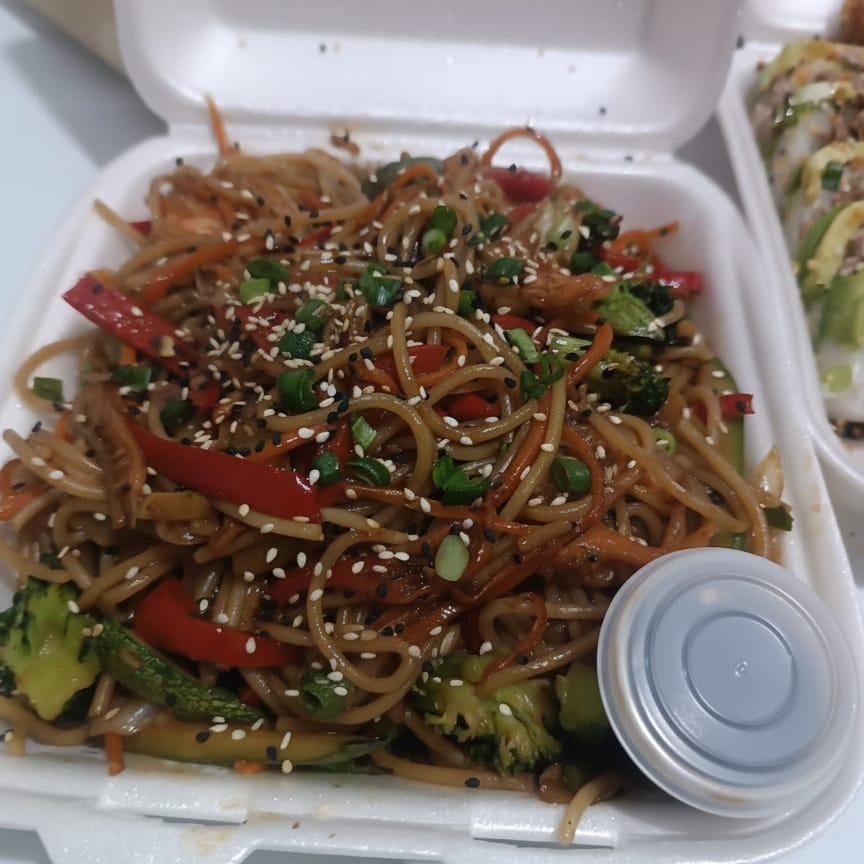 Fideos salteados a la plancha con verduras julianas, mantequilla, ajo, sal y pimienta.