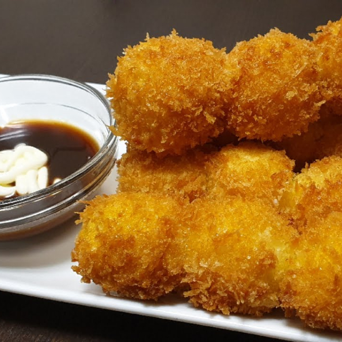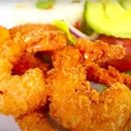Camarón con queso philadelphia empanizado con panko acompañadas de salsa kushiagues