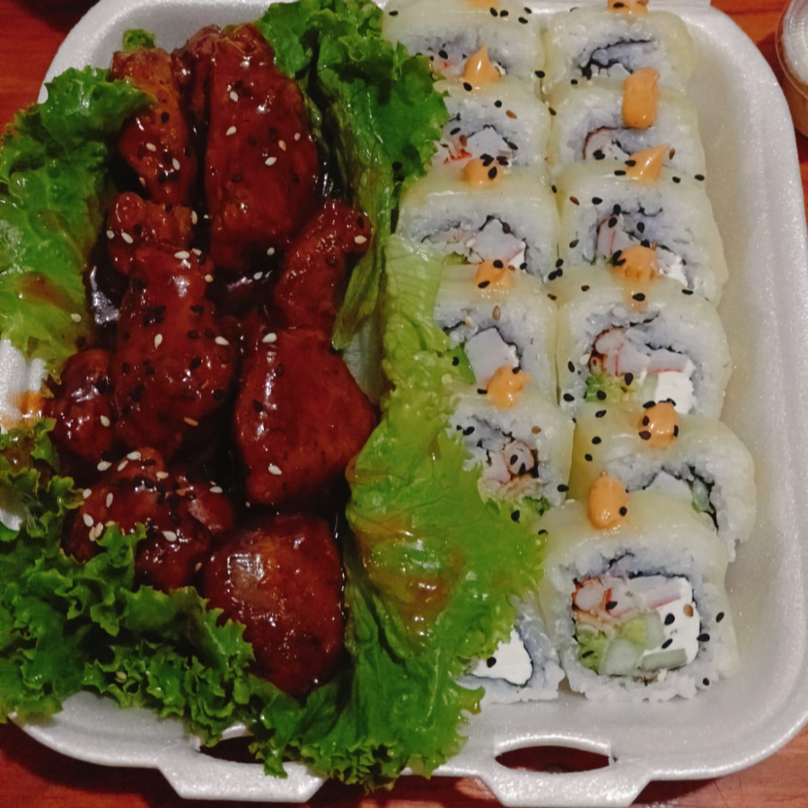 pollo agridulce con rollo kani maki ( rollo de sushi P.d. surimi agucate, filadelphia P.f. ajonjoli tostado