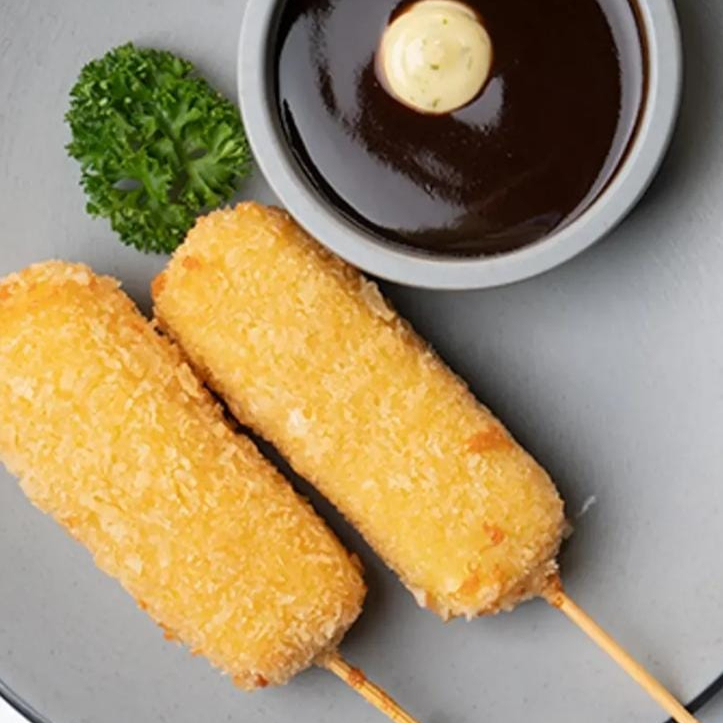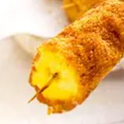 brochetas fritas de Platano Macho con Queso Manchego Empanizado con Panko Acompañado de Salsa kushiage