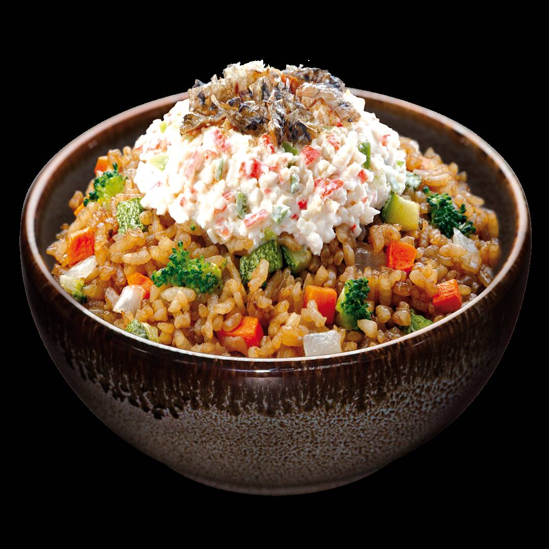 Arroz frito a la plancha con verduras, sazonado con mantequilla, ajo, sal y pimienta.