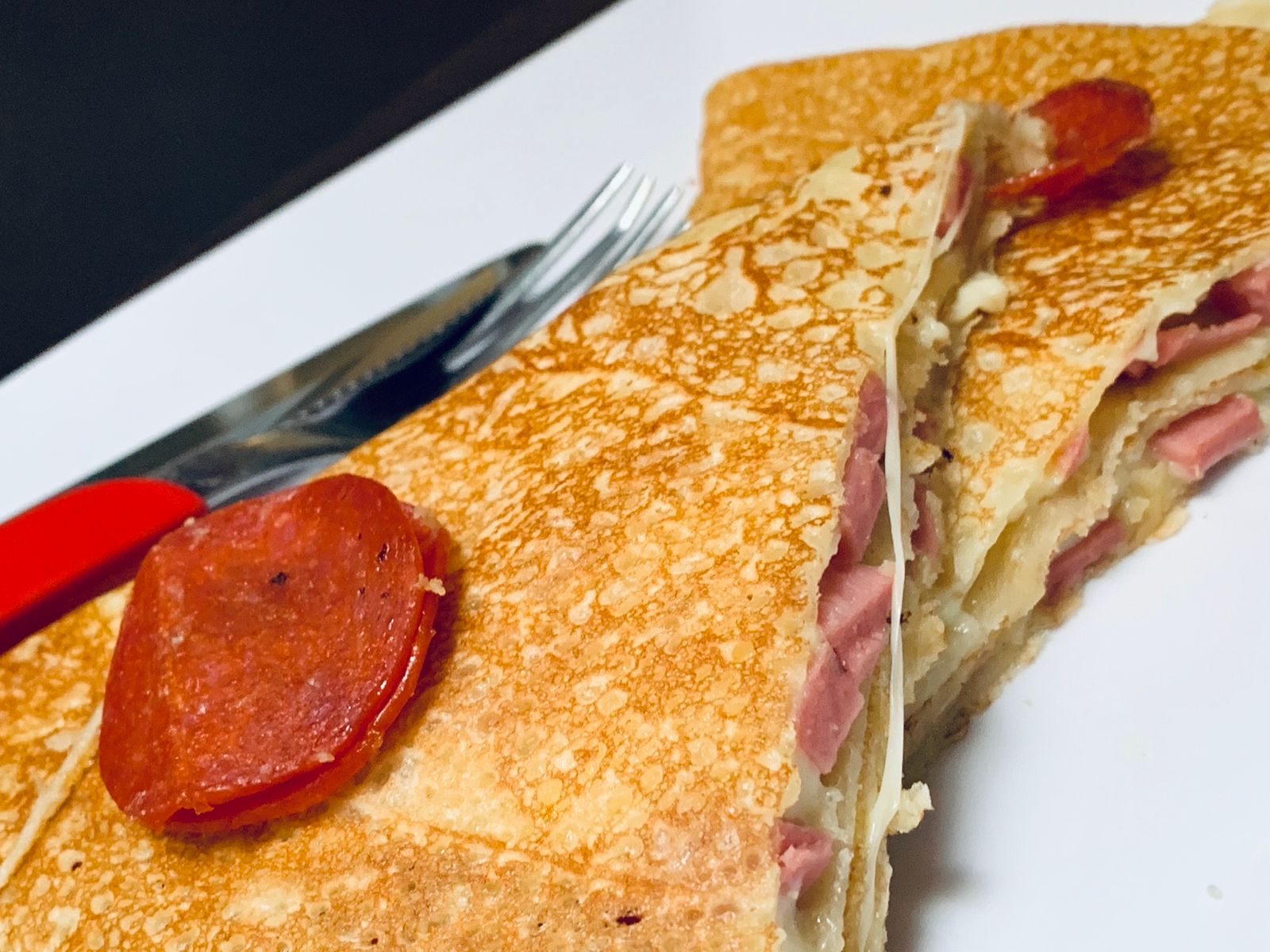 Jamón, queso, bañada en salsa.