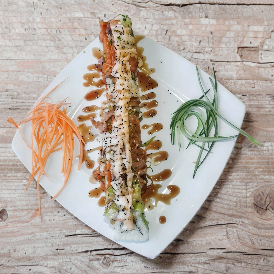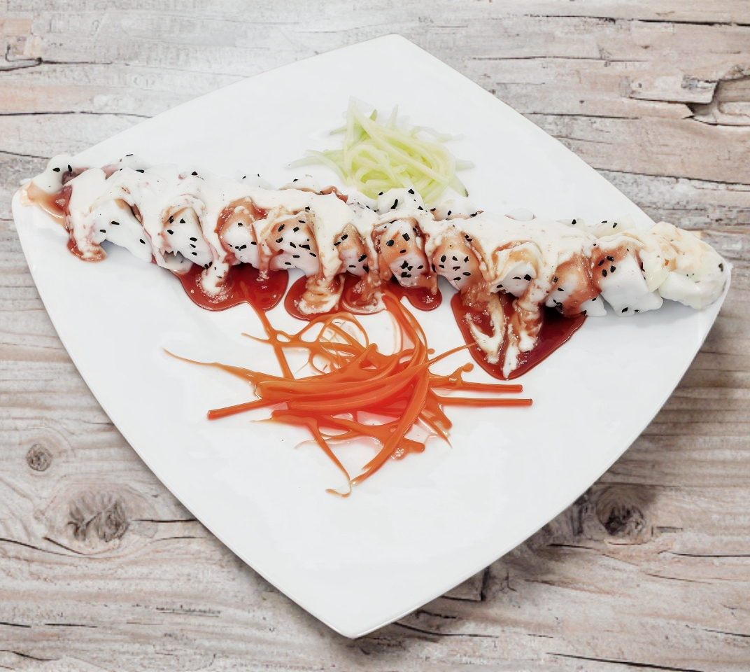 Para una persona. Camarón, Philadelphia y aguacate. Queso fundido picante y salsa de anguila