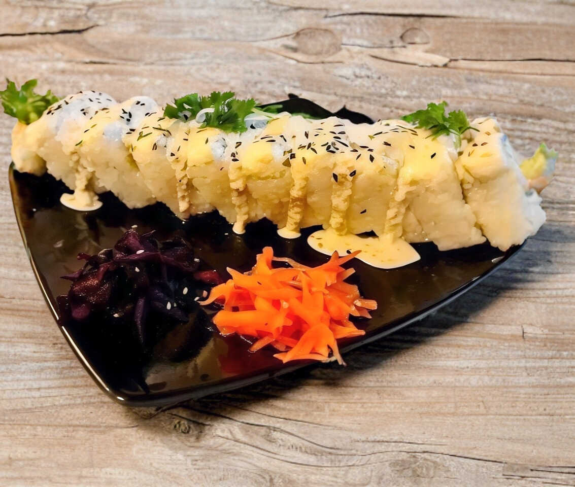 Por Dentro: Camarones empanizados y aguacate Por Fuera: Philadelphia y Tampico