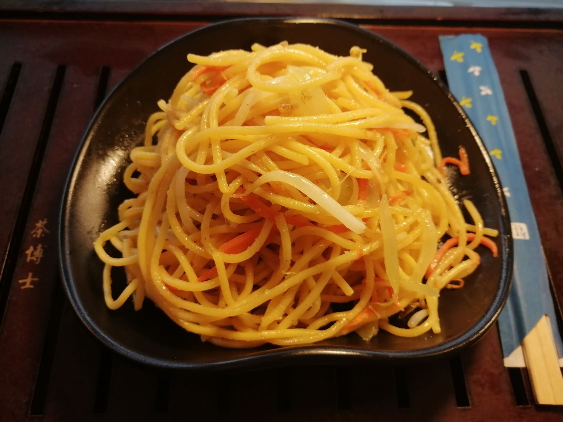 Espagueti con pollo y terminado de soya