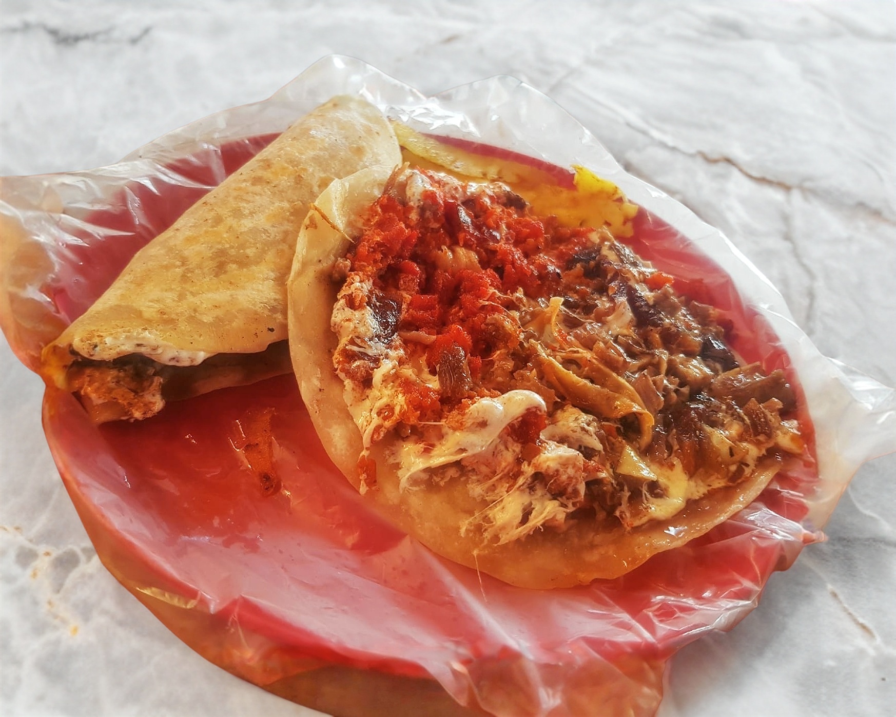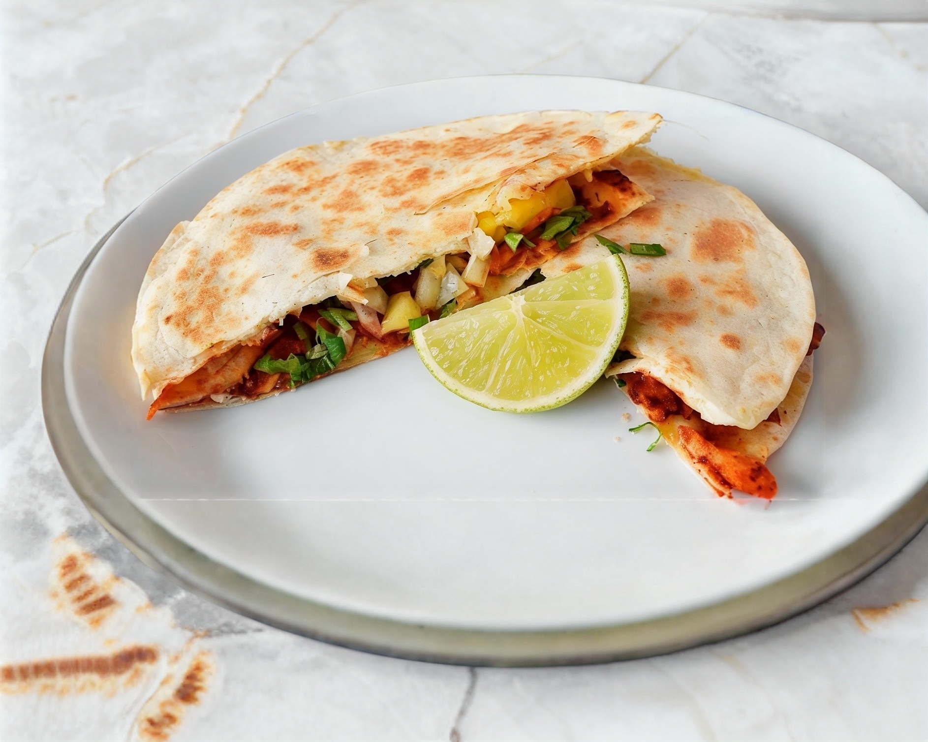 Doble tortilla de harina rellenas de queso fundido y con carne de tu elección, acompañado de verdura y salsas.