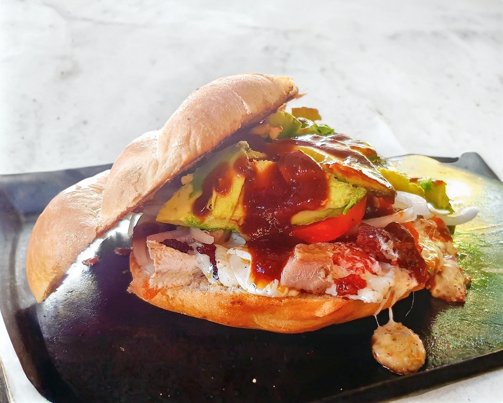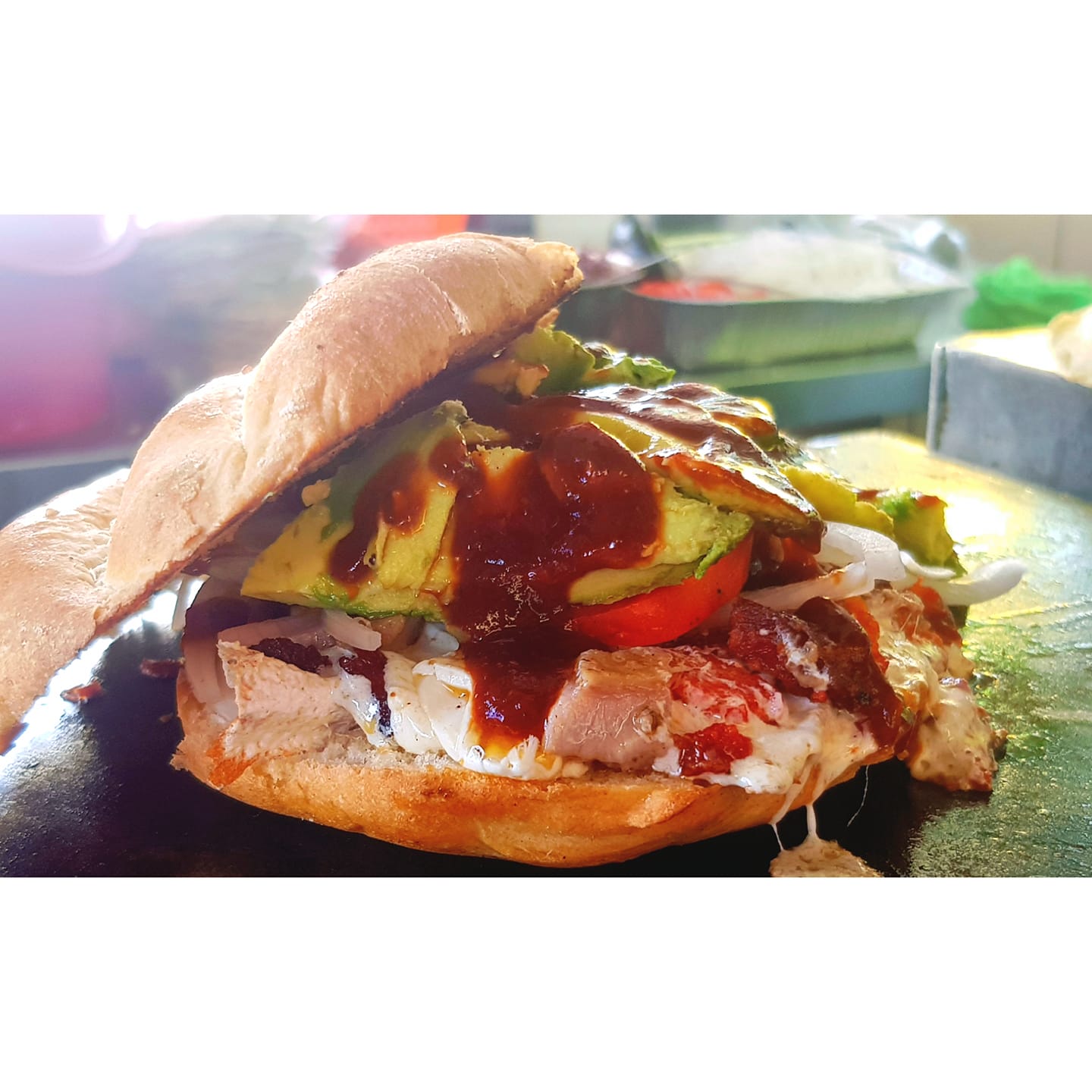 Carne de pastor, lechuga, queso, aguacate, piña, tocino, jitomate, cebolla y catsup.