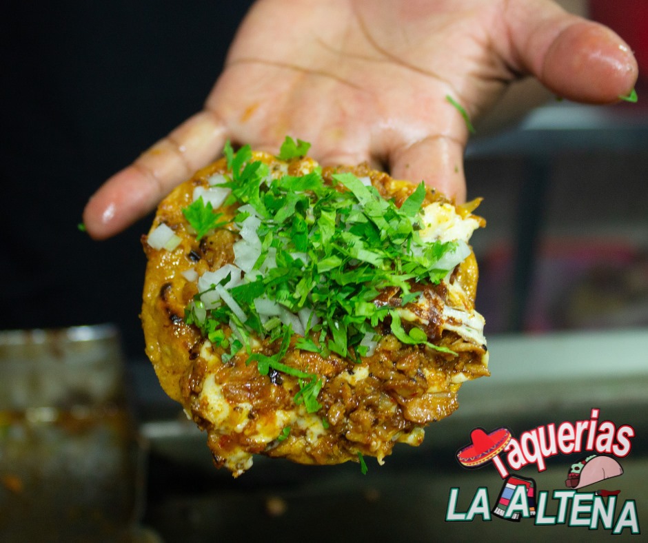 Tortilla de maíz dorada con una costra de queso y con carne de tu elección, acompañado de verdura y salsas.
