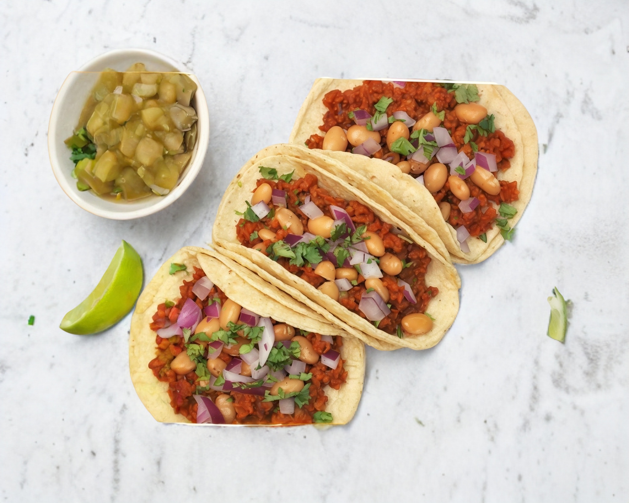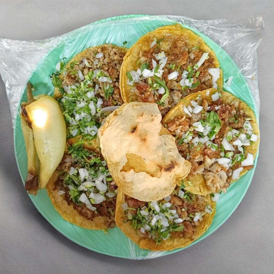 Doble tortilla de maíz con deliciosa tripa, acompañado de verdura y tus salsas favoritas.