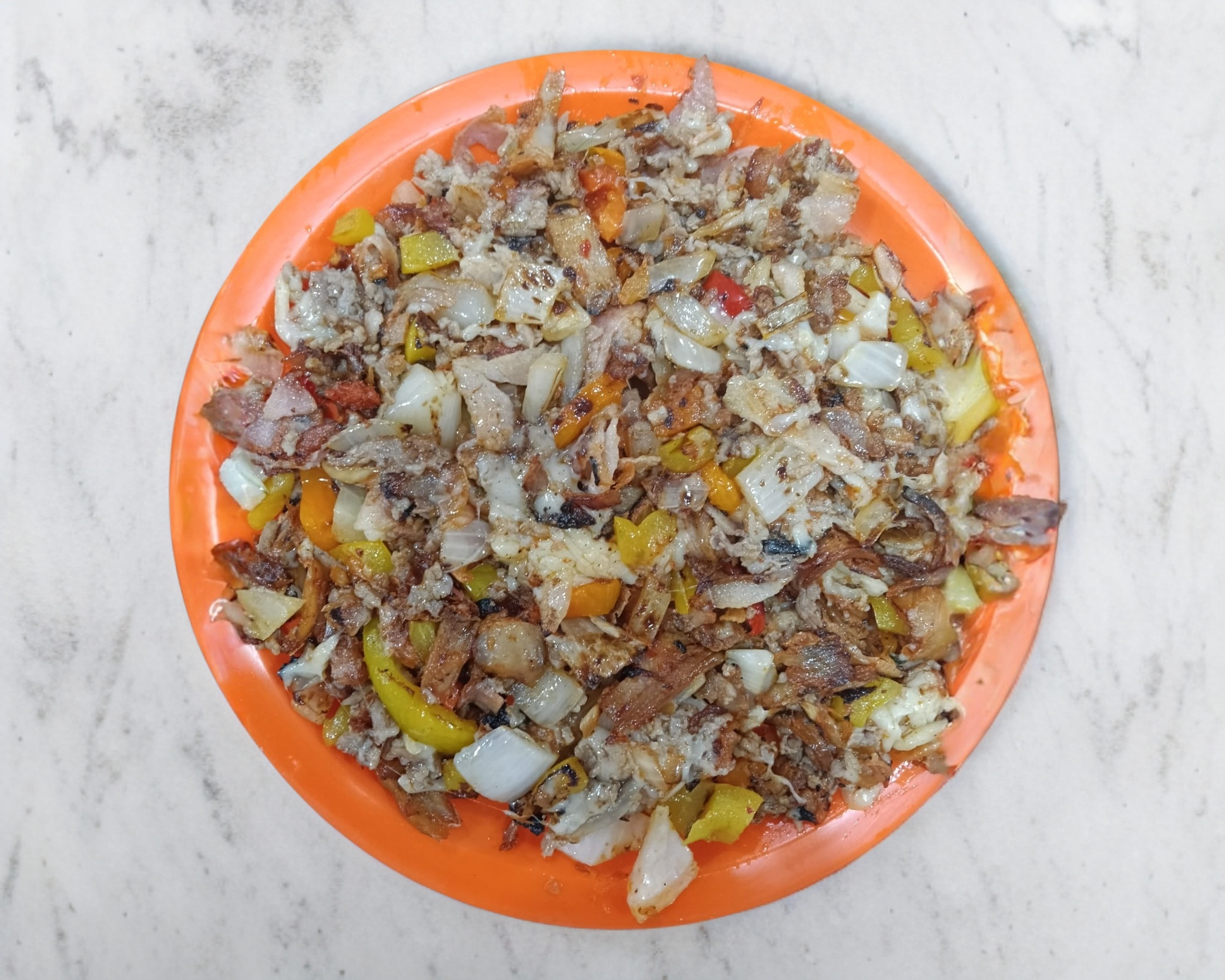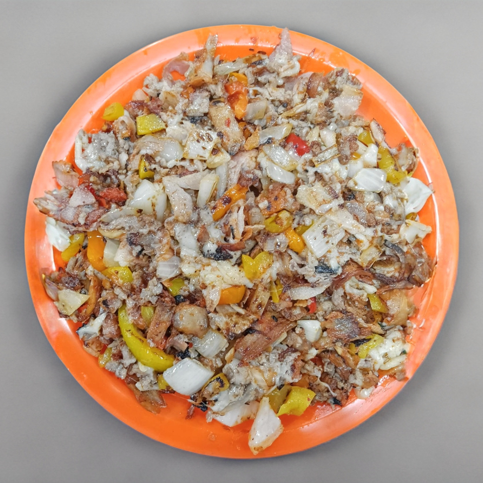 Orden de pastor, tocino, jamón, tocino, queso, piña y cebolla.