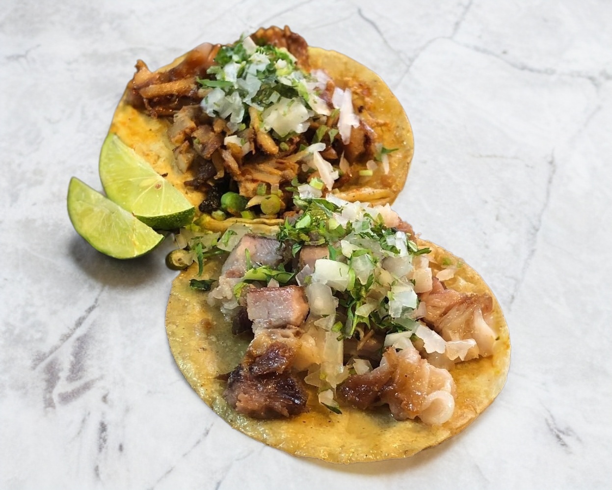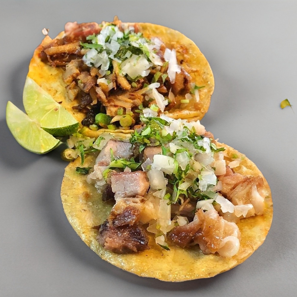 Doble tortilla de maíz con carne de pastor, acompañado de verdura y tus salsas favoritas.
