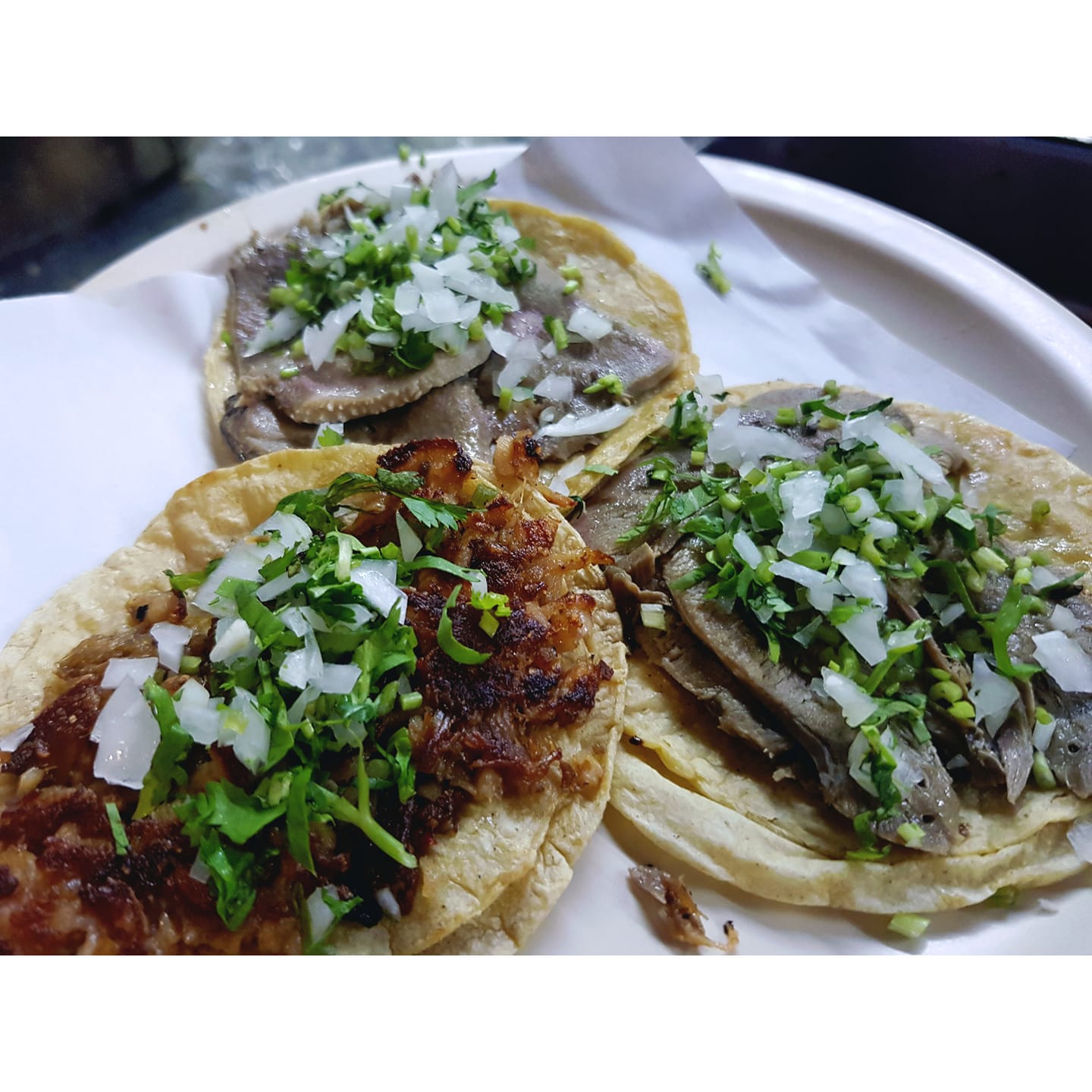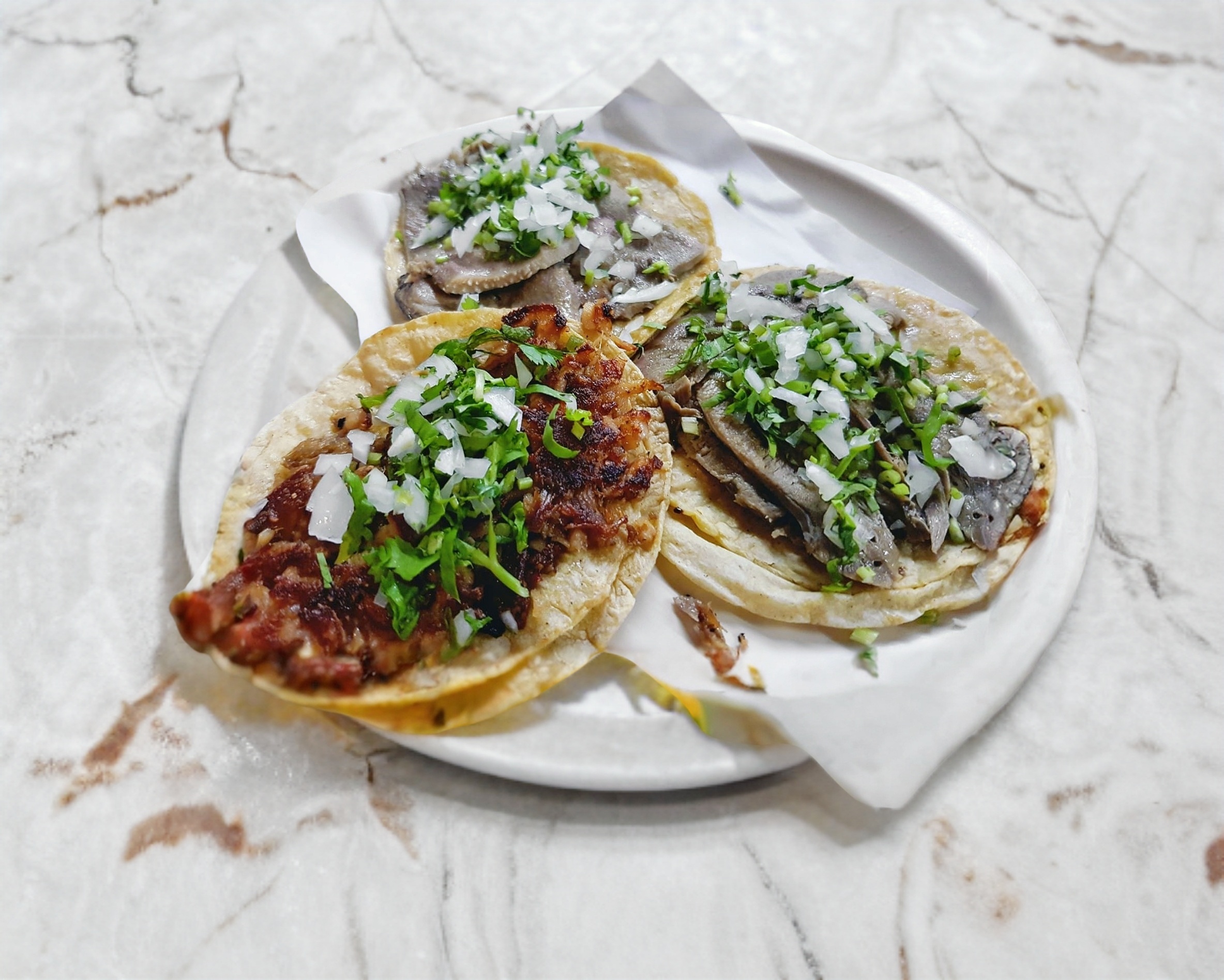 Doble tortilla de maíz con lengua, acompañado de verdura y tus salsas favoritas.