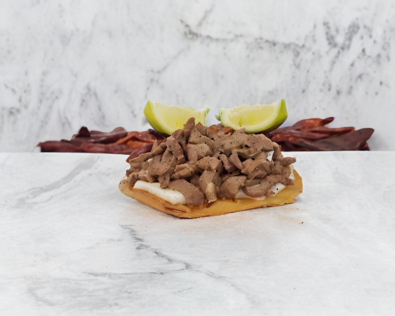 Doble tortilla de maíz con sesos, acompañado de verdura y tus salsas favoritas.