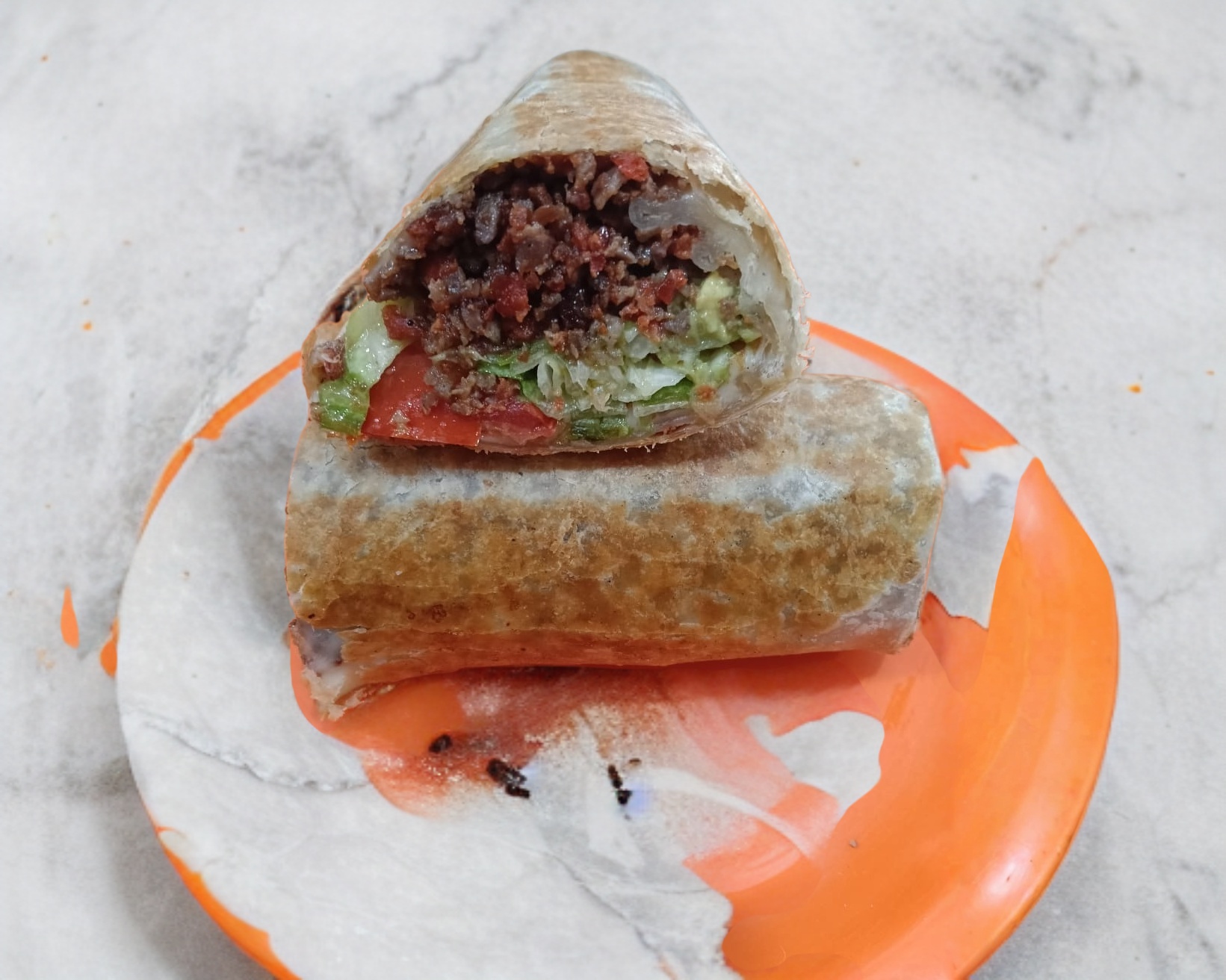 Tortilla de harina tamaño jumbo con carne a elegir, frijoles, queso, aguacate, lechuga, cebolla y jitomate.
