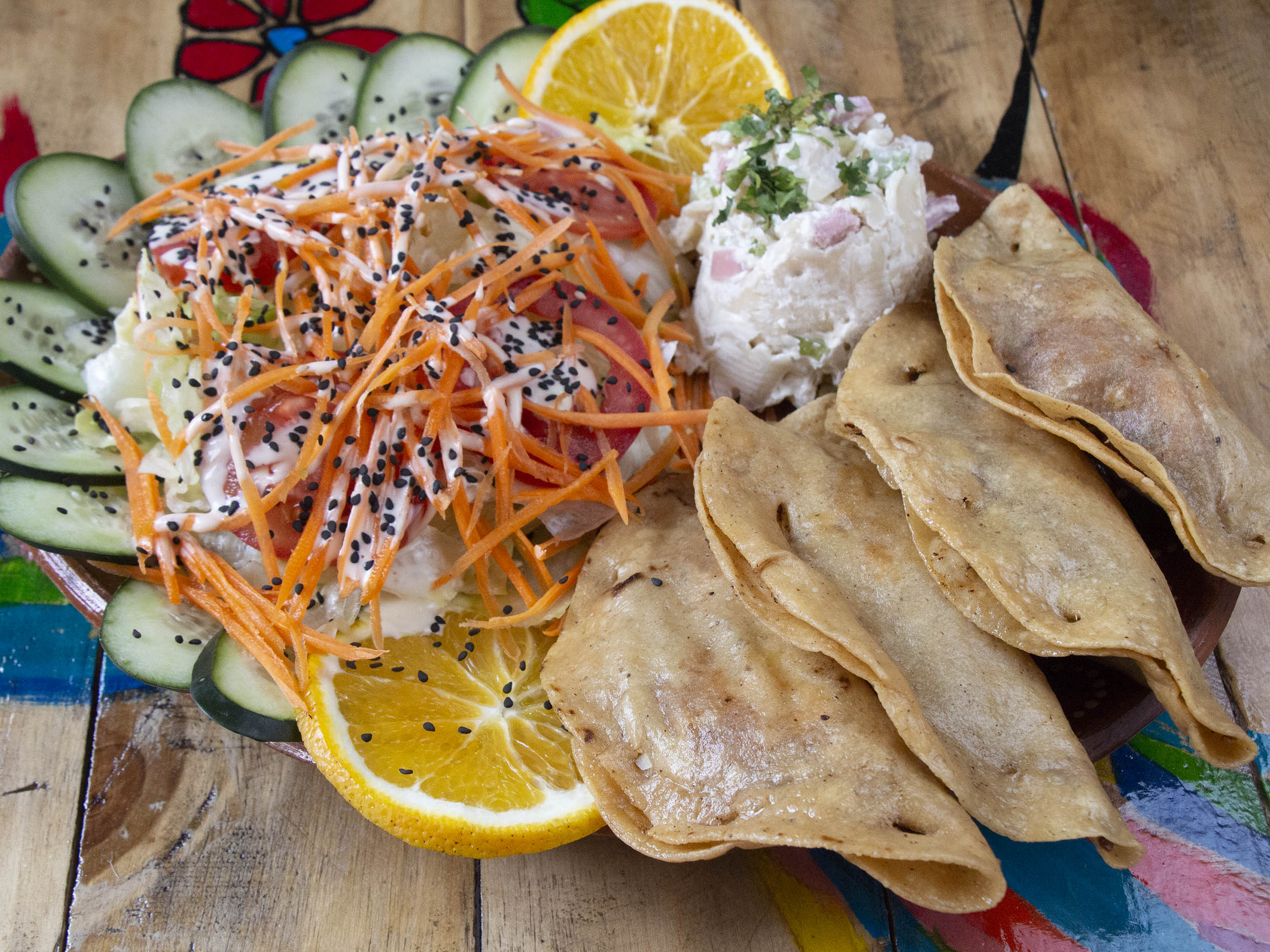 3 rellenas de marlín con chimichurri acompañadas de ensalada, sopa fría.