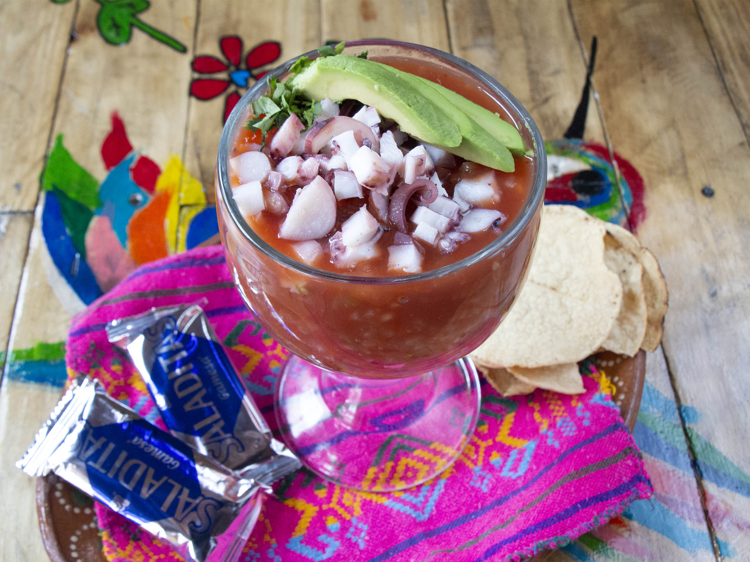 Pulpo y camarón con salsa preparada con jitomate, cebolla acompañado de salsas y galletas (4 tostadas y 3 galletas)